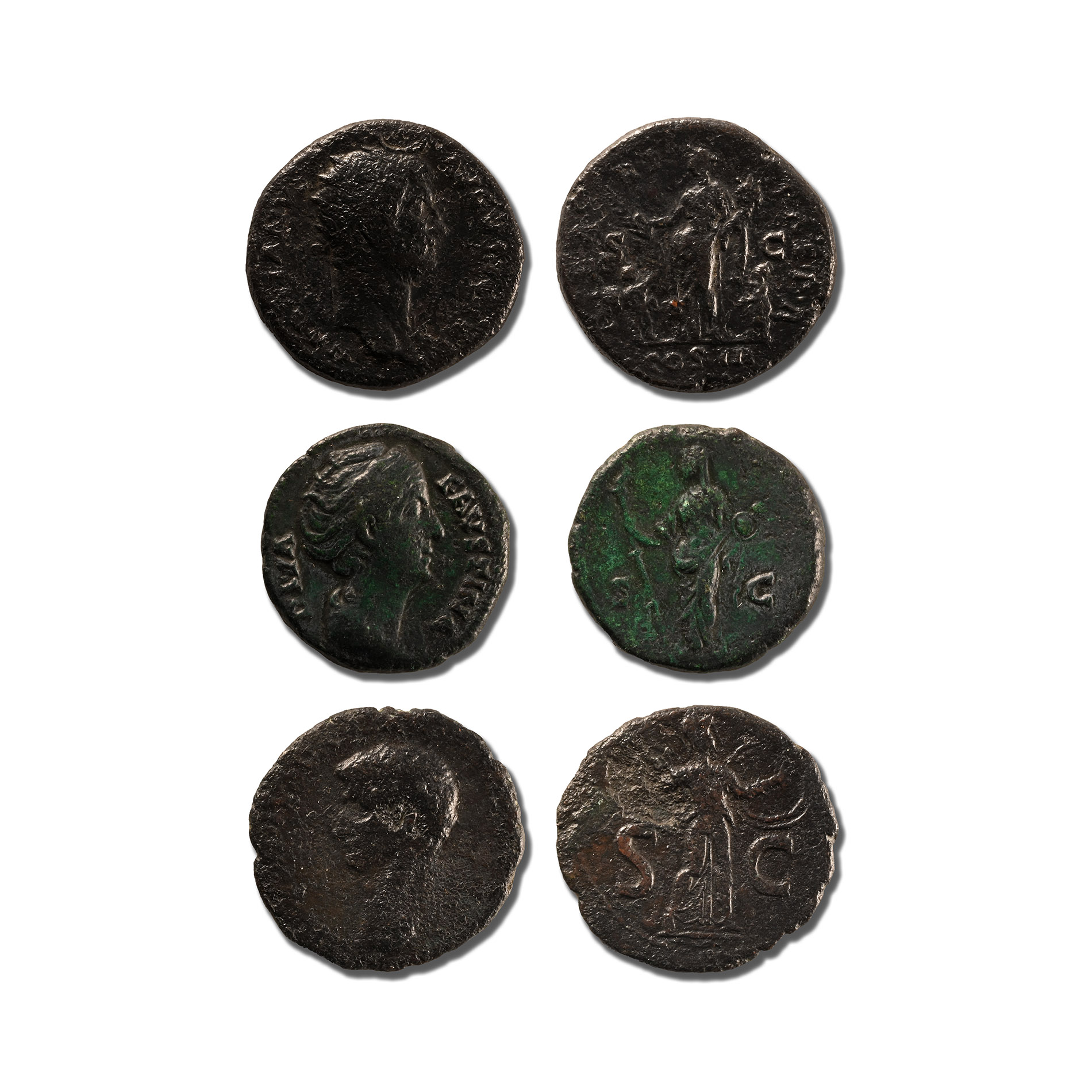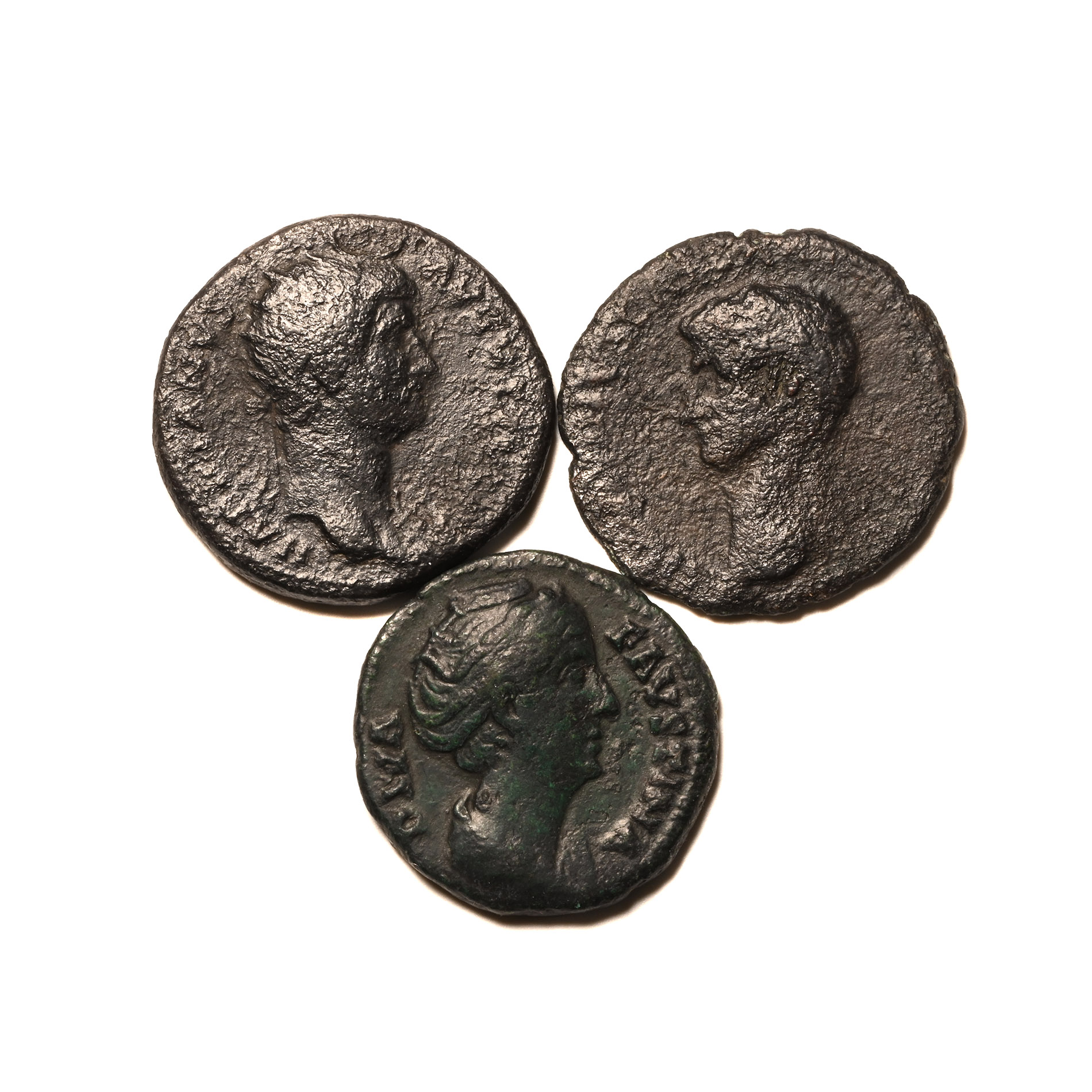 Group comprising: bronze ases of Claudius, Hadrian, and Faustina Senior; various issues and types. 28.85 grams total.
