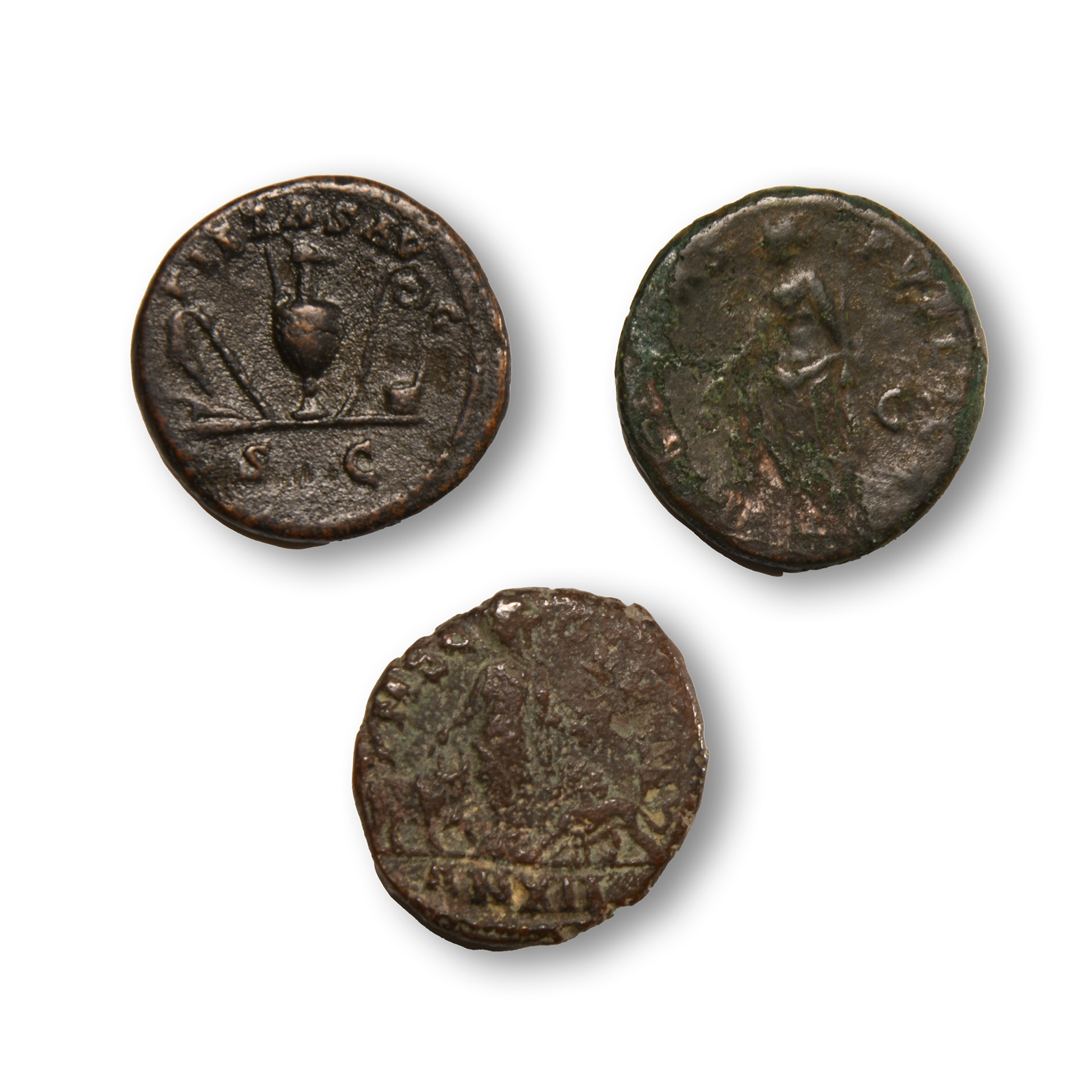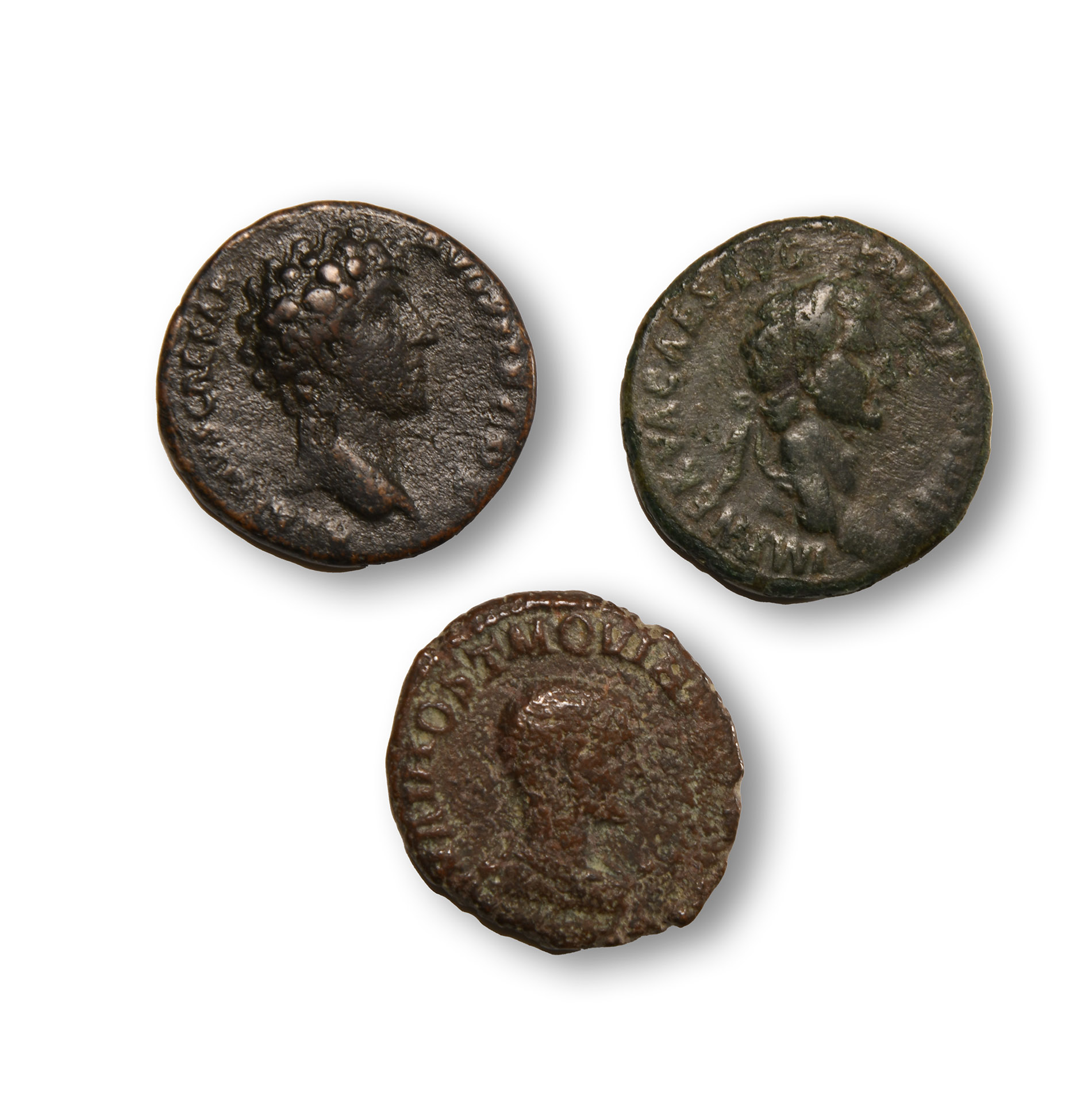 Comprising bronze As (1/16 of a denarius) coins of: Nerva (96-98 A.D.), Marcus Aurelius (161-180 A.D.), and Hostilian (251 A.D.). 33.72 grams total, 27 mm each.