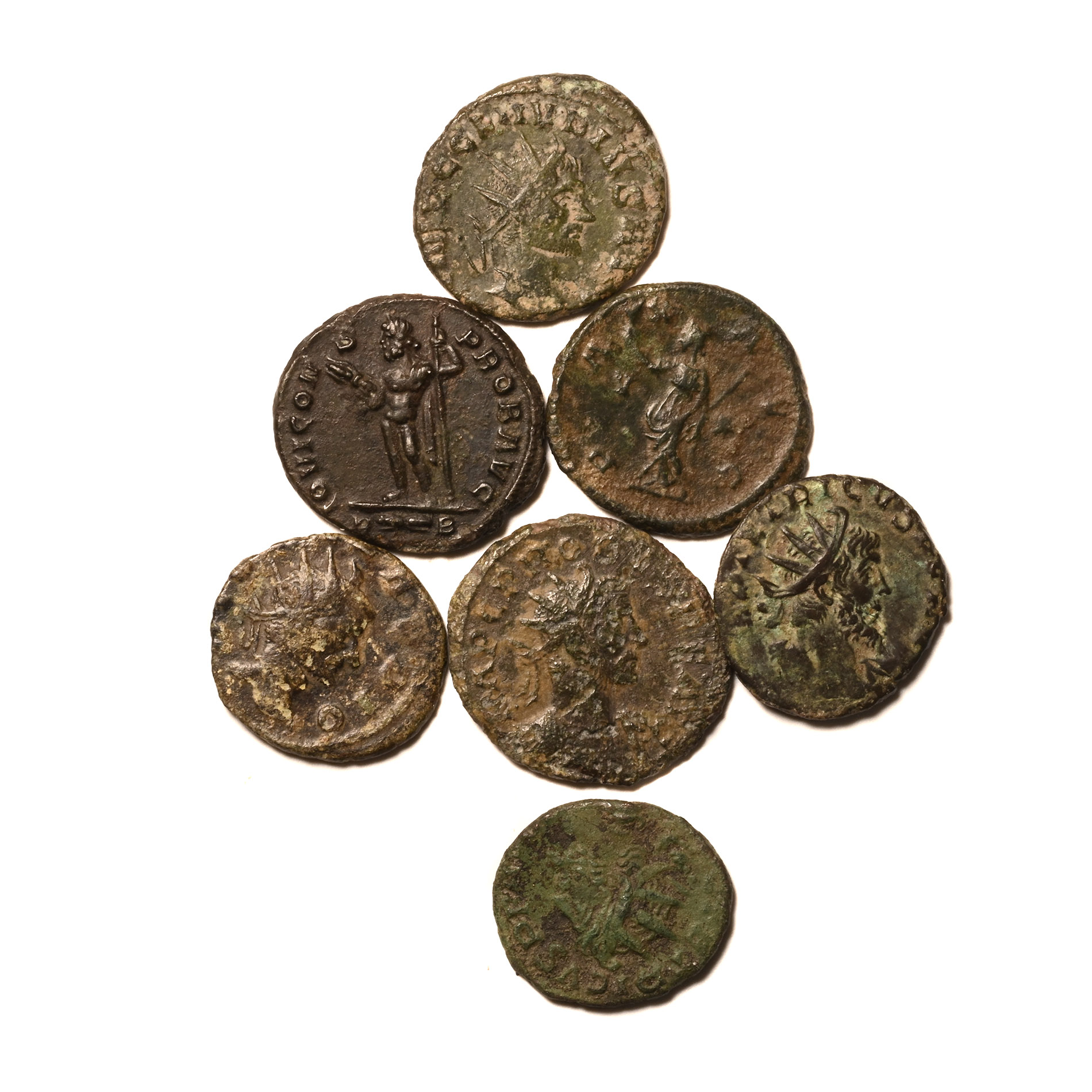Group comprising: bronze antoninianus of various emperors including Probus, Claudius II, Tetricus, and Postumus; various issues and types. 21.81 grams total.