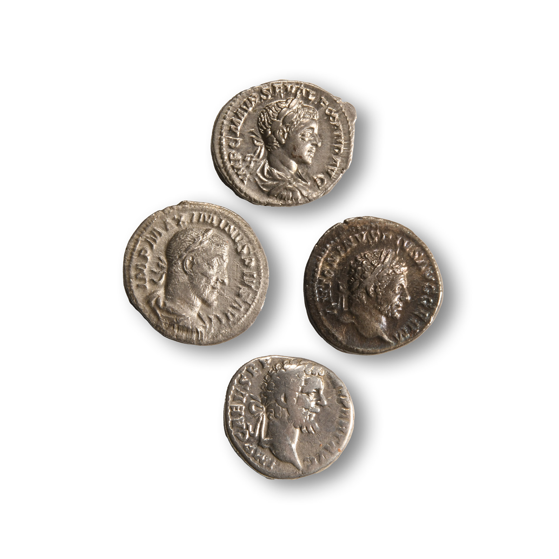 Comprising silver denarii of: Antoninus Pius (138-161 A.D.), Septimius Severus (193-211 A.D.), Severus Alexander (222-235 A.D.), and Maximinus I (235-238 A.D.). 10.56 grams total, 17-20 mm.