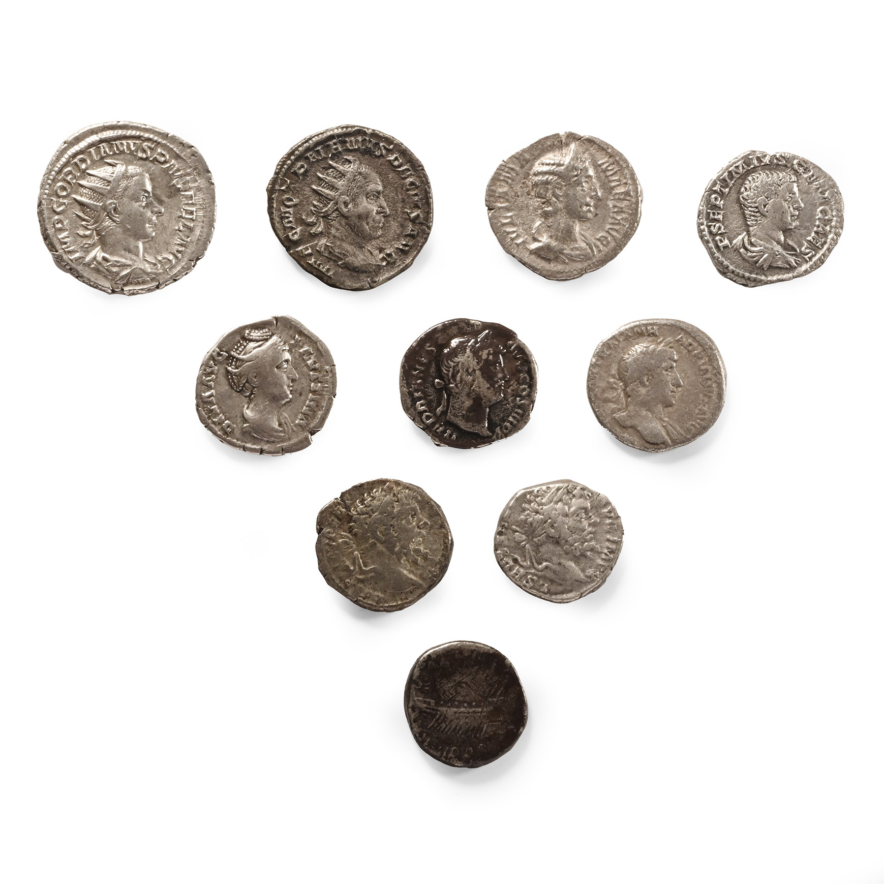 Mixed group comprising: various emperors, issues and reverse types, including denarius of Mark Antony, Hadrian, Septimius Severus, Faustina Senior, Julia Mamaea, and Geta, with antoninianus of Gordian III and Trajan Decius. 31.83 grams total, 16-22 mm.