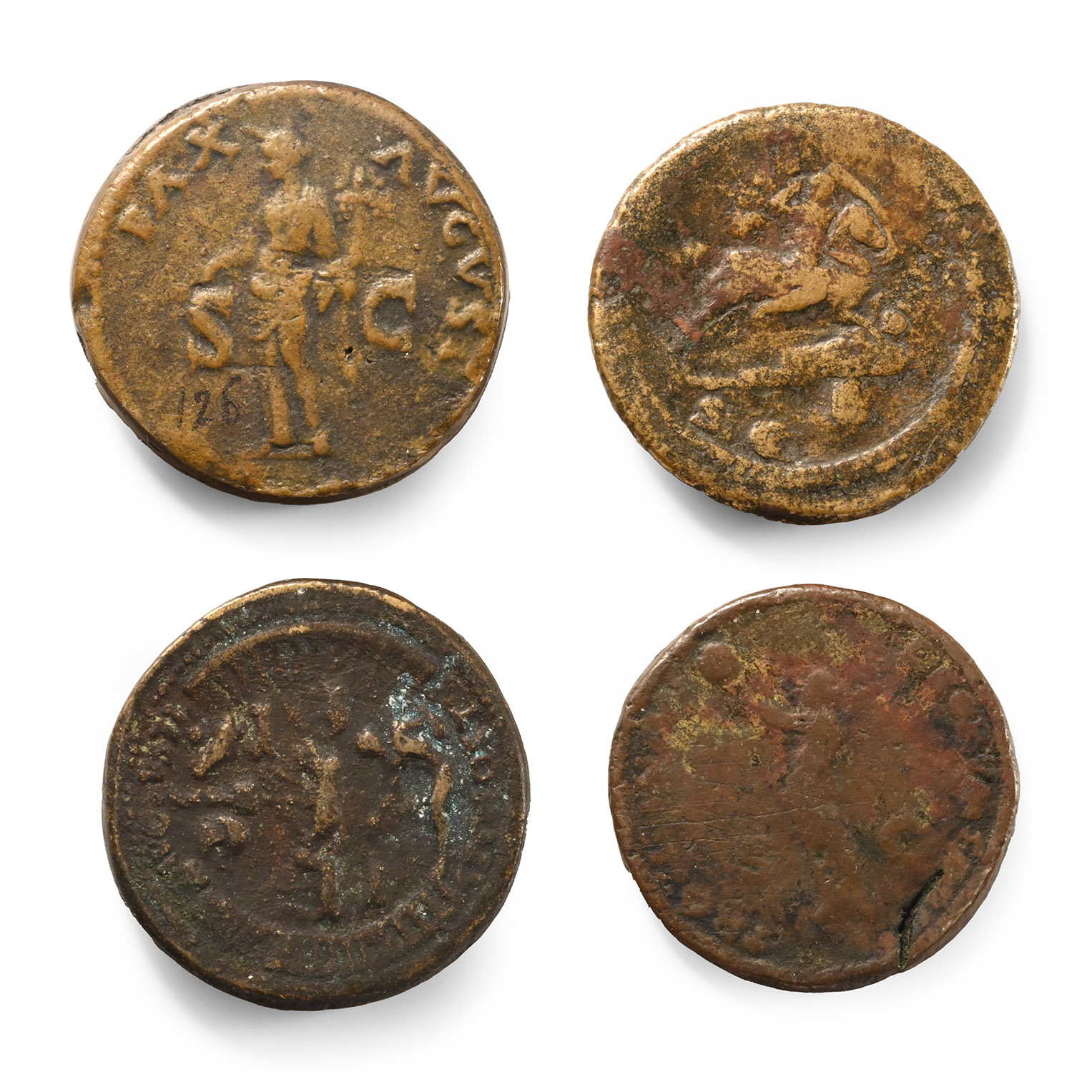 Comprising: cast copies of Paduan Roman sestertius coins including those of Nero, Vespasian, and Domitian. 95 grams total, 32-34 mm.