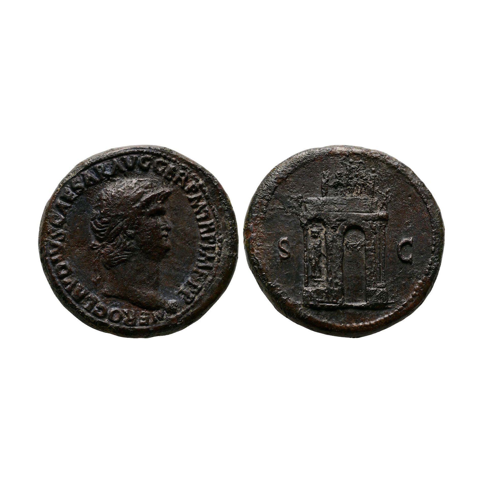 Rome mint. Obv: NERO CLAVDIVS CAESAR AVG GERM P M TR P IMP P P, laureate bust right wearing aegis. Rev: S-C, Nero's triumphal arch, surmounted by quadriga, statue of Mars between columns. 25.43 grams.