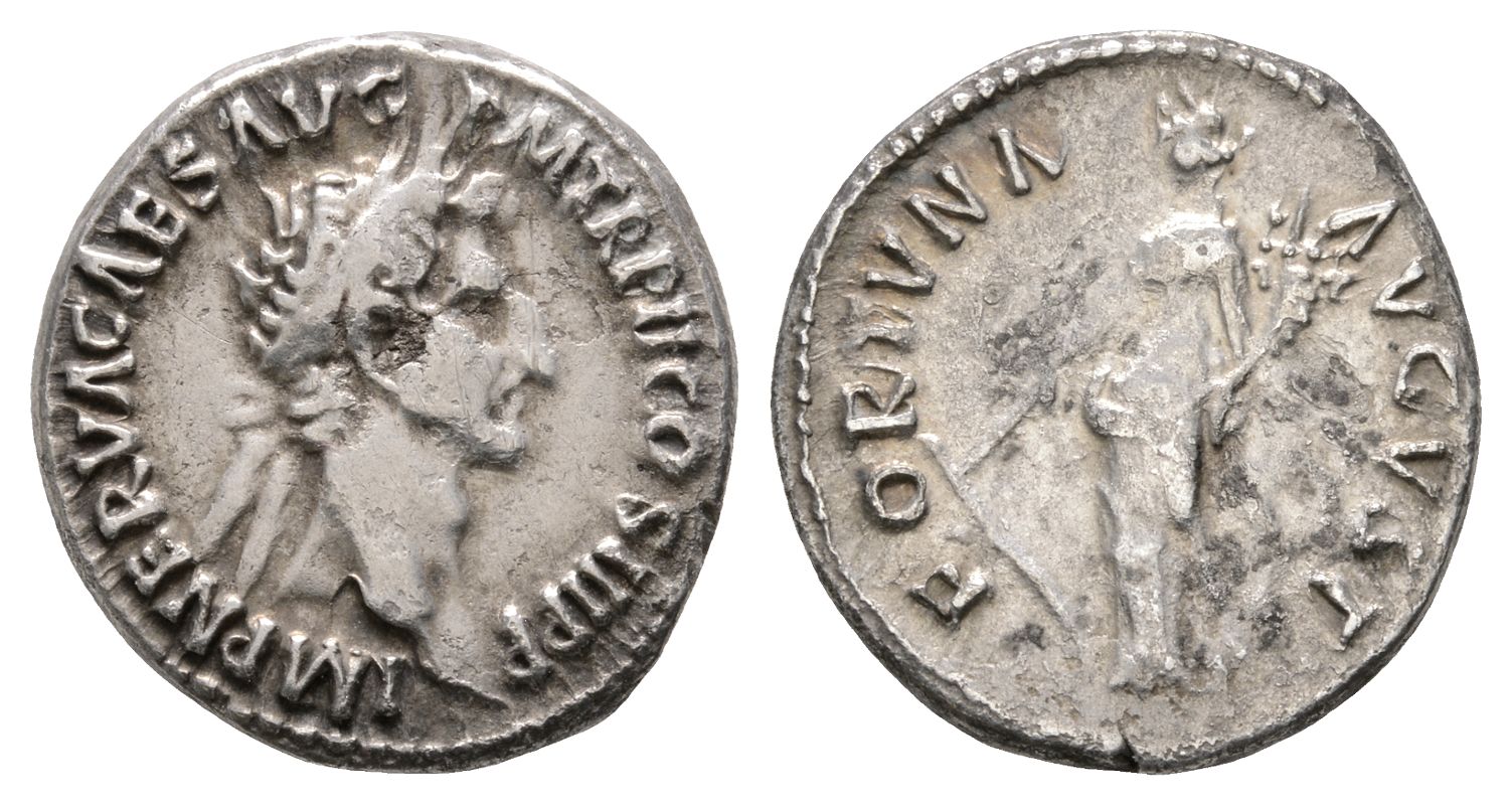 Rome mint; struck AD 97. Possibly contemporary imitation. IMP NERVA CAES AVG P M TR P II COS III P P, laureate head to right / FORTVNA AVGVST, Fortuna standing facing, head to left, holding cornucopiae and rudder. RIC II 28; BMCRE 57; RSC 71. 3.16gr, 17mm