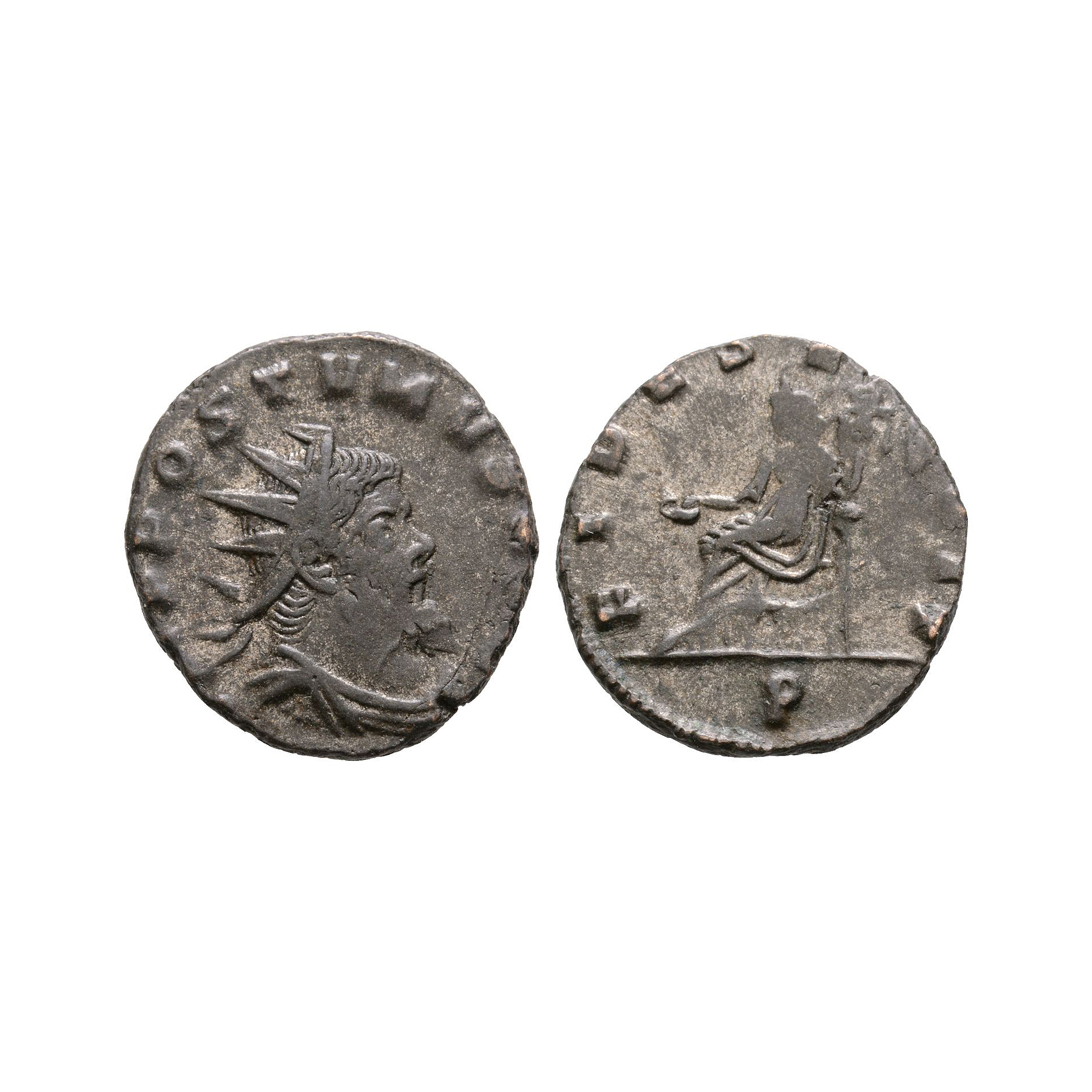 Milan mint. Obv: IMP POSTVMVS AVG legend with radiate and draped bust right. Rev: FIDES EQVIT legend with Fides seated left holding patera and standard; P in exergue. 3.06 grams.