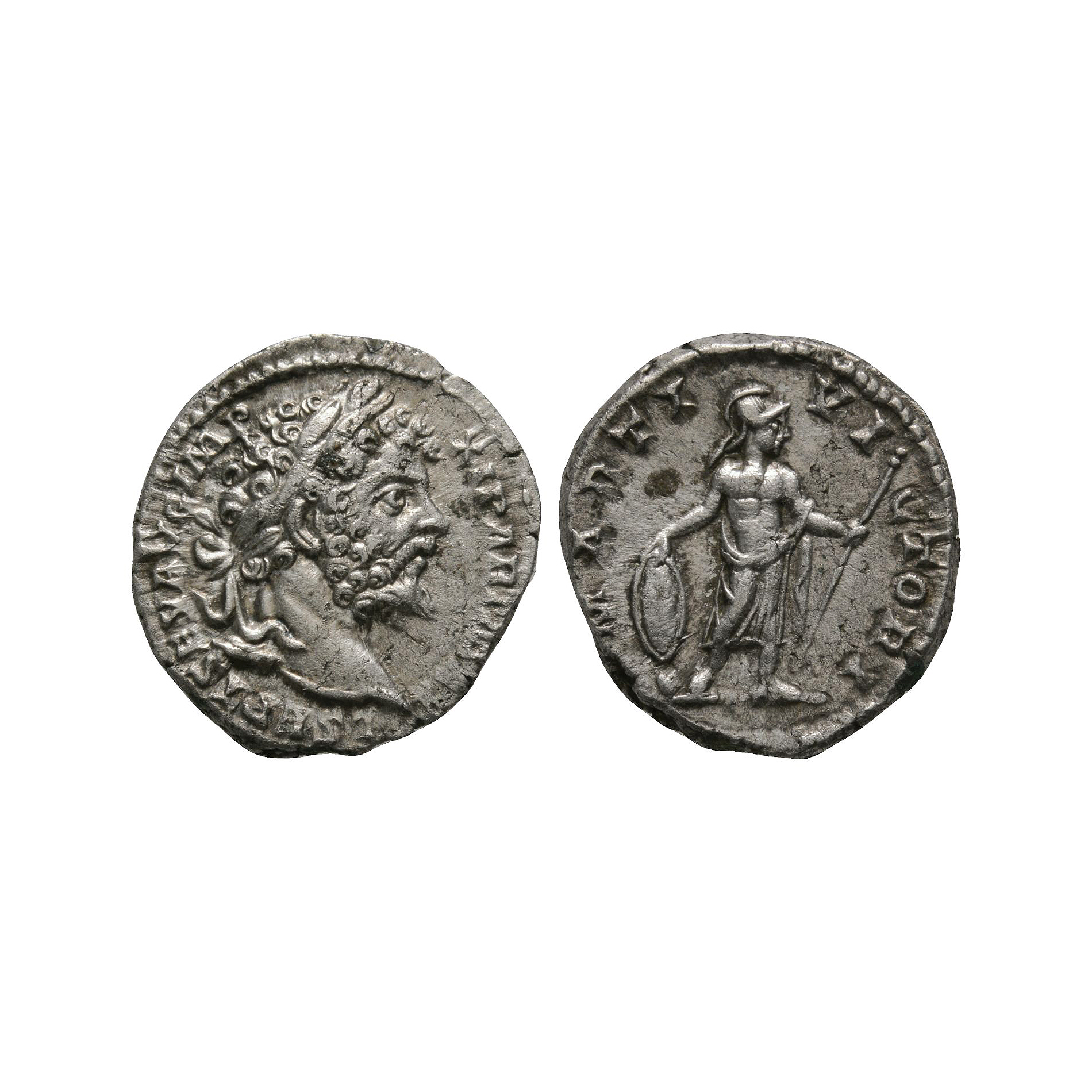 Rome mint. Obv: L SEPT SEV AVG IMP XI PART MAX, laureate head right. Rev: MARTI VICTORI, Mars, helmeted, naked to waist, chlamys draped over left arm, standing U facing, head left, holding spear, right hand on shield resting on helmet. 3.12 grams, 18.16 mm.