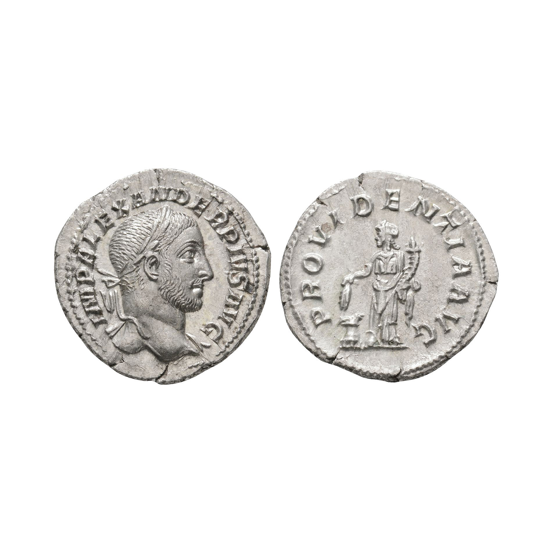 Obv: IMP ALEXANDER PIVS AVG, laureate head right, slight drapery on left shoulder. Rev: PROVIDENTIA AVG, Providentia standing left, holding corn ears over modius and cornucopiae. 2.80 grams, 20 mm.