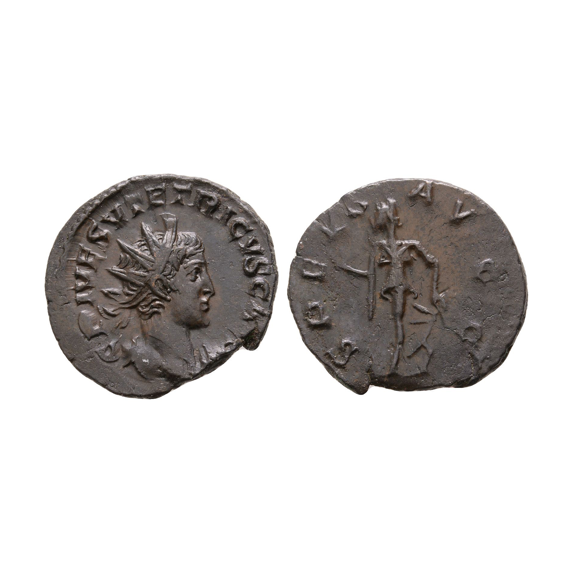 Trier mint. Obv: C PIV ESV TETRICVS AVG, radiate and draped bust right. Rev: SPES AVGG, Spes walking L holding flower and raising hem of robe. 2.87 grams, 20 mm.
