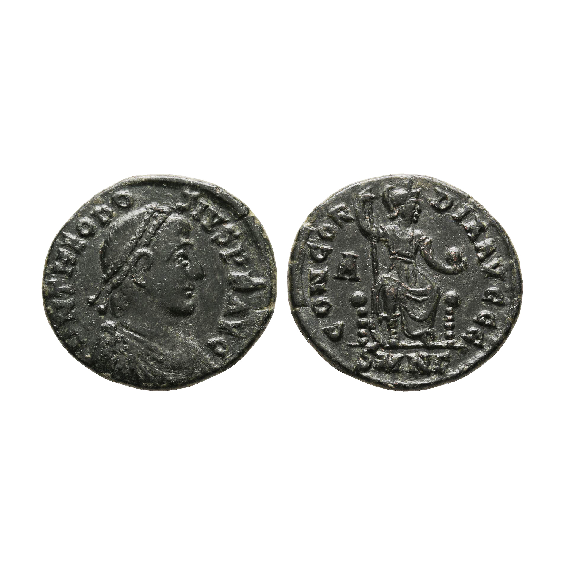 Nicomedia mint. Obv: DN THEODO-SIVS PF AVG, pearl-diademed, draped and cuirassed bust right. Rev: CONCOR-DIA AVGGG, Constantinople, helmeted, seated facing, looking right, foot on prow, her right leg uncovered, holding globe and spear, the lower part of which is hidden by her robe, A in left field, mintmark SMN Gamma. 2.36 grams, 18 mm.