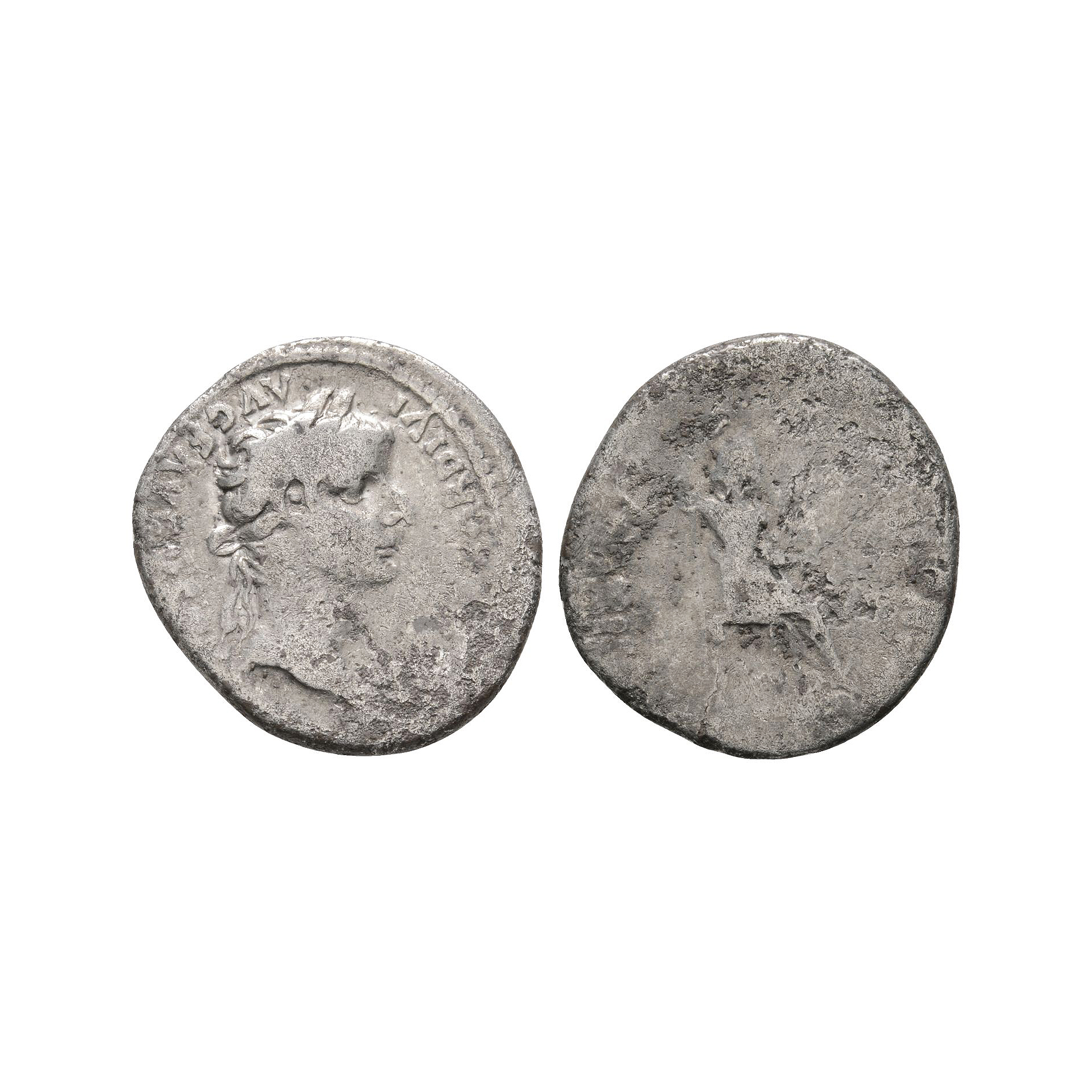 Lugdunum mint. Obv: TI CAESAR DIVI AVG F AVGVSTVS, laureate head right. Rev: PONTIF MAXIM, Livia (as Pax) seated right, holding olive-branch and inverted spear; ornate legs to chair. 3.19 grams, 19 mm.