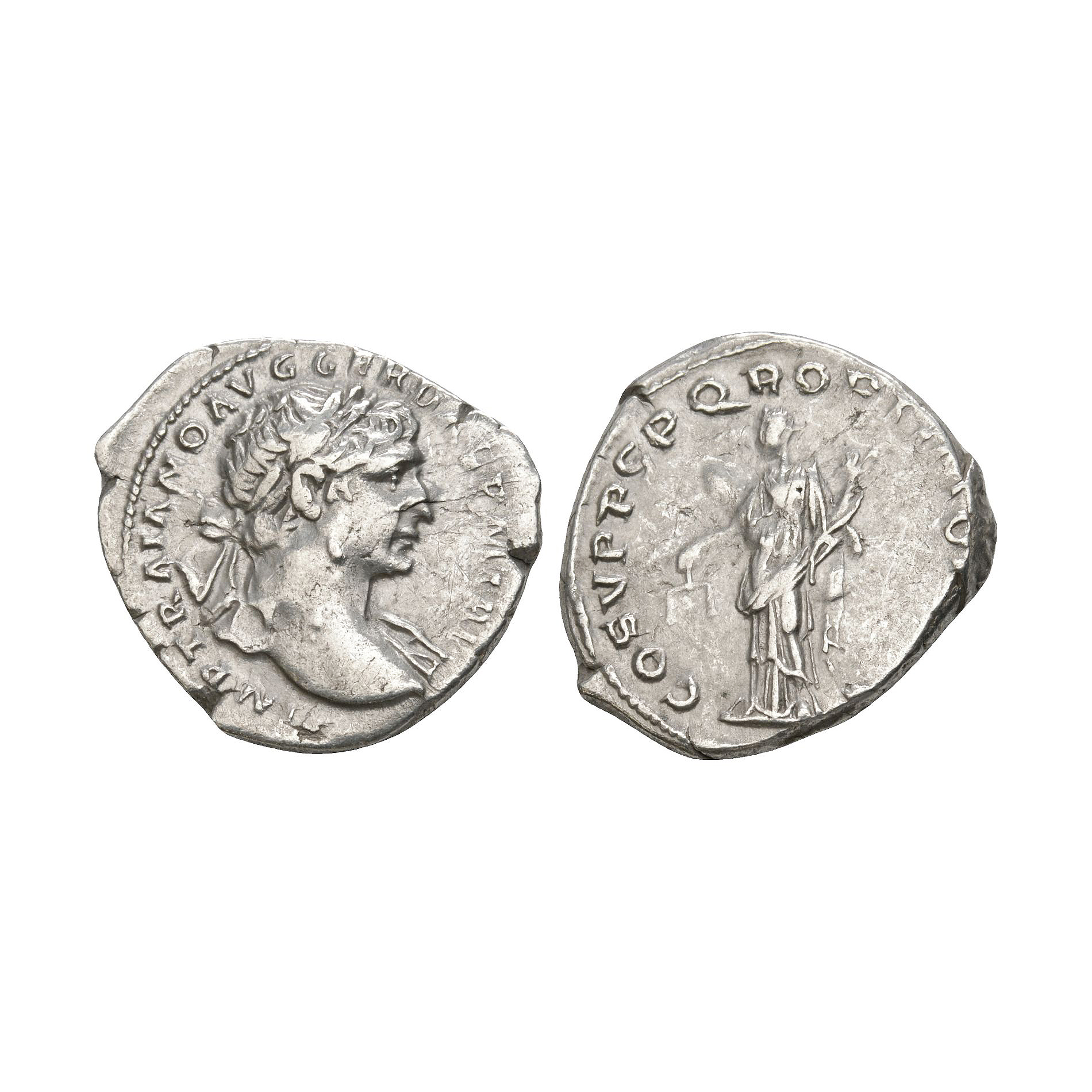 Rome mint. Obv: IMP TRAIANO AVG GER DAC P M TR P legend with laureate bust right. Rev: COS V P P A P Q R OPTIMO PRINC legend with Aequitas standing left holding scales and cornucopia. 3.19 grams.