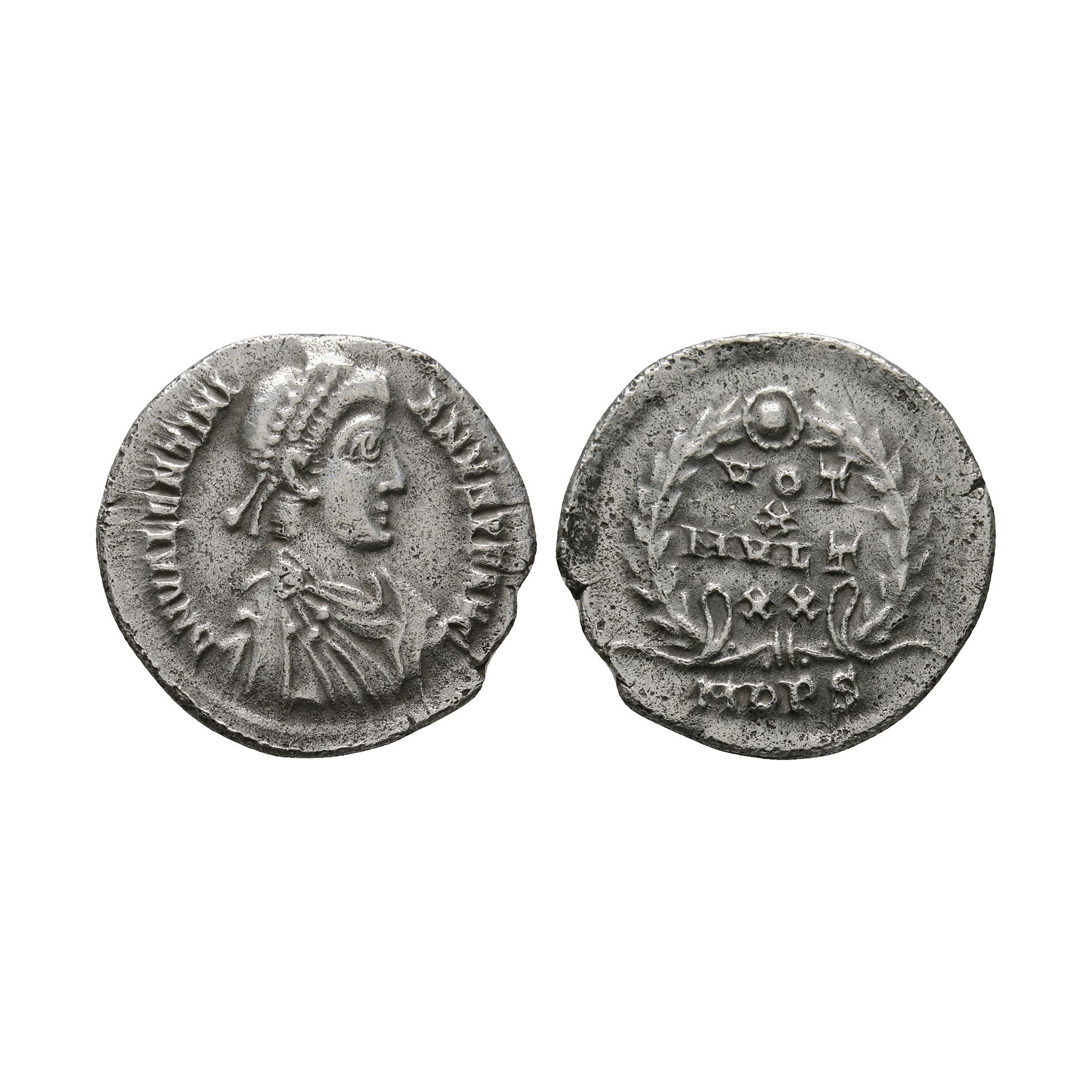 Milan mint. Obv: DN VALENTINI-ANVS PF AVG, pearl-diademed, draped, cuirassed bust right. Rev: VOT X MVLT XX within wreath, mintmark MDPS. 1.73 grams 17 mm.