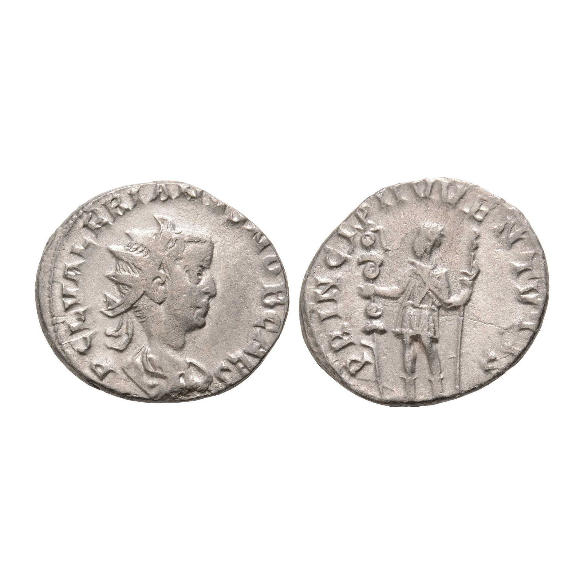 Rome mint. P C L VALERIANVS NOB CAES, radiate bust right. Rev: PRINCIPI IVVENTVTIS, Valerian II standing left, holding standard and inverted spear. 3.09 grams, 20 mm.