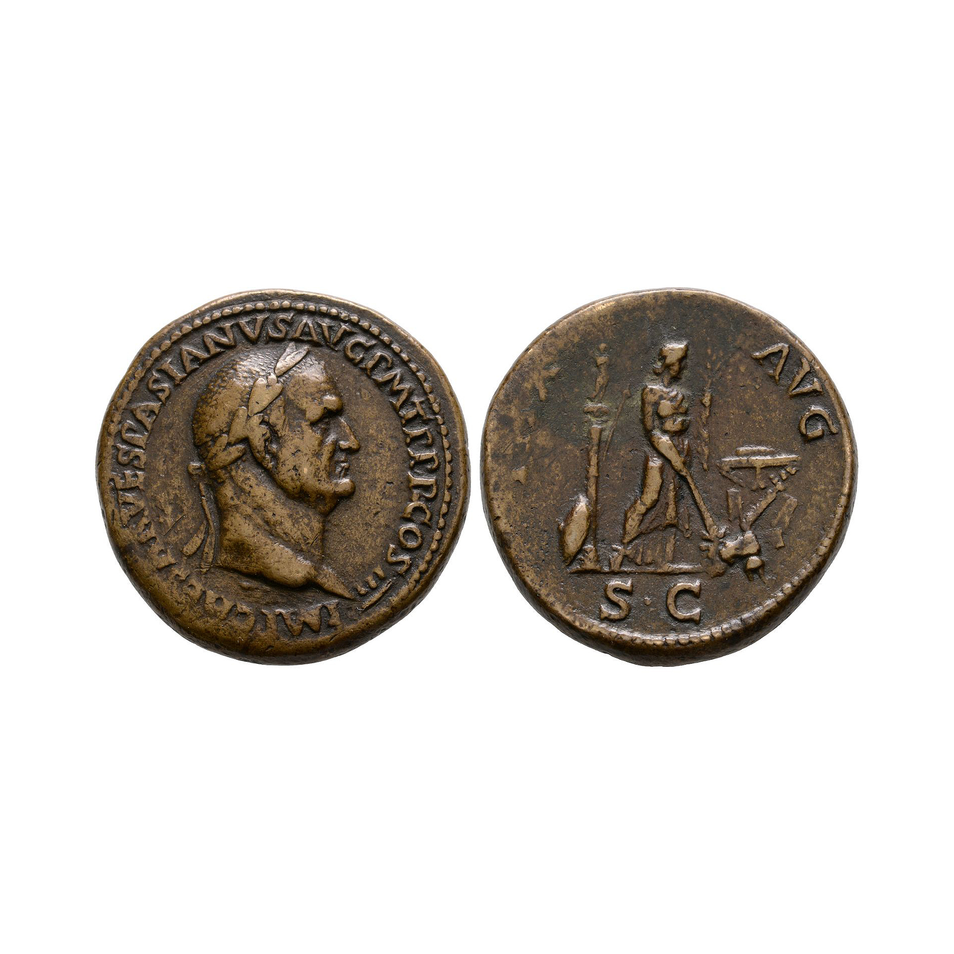 Obv: IMP CAESAR VESPASIANVS AVG P M TR P P COS III legend with laureate bust right. Rev: PAX AVG legend with Pax standing right holding branch in left hand lighting pile of arms before with torch in right with statute of Minerva on column behind; S C in exergue. 27.50 grams.