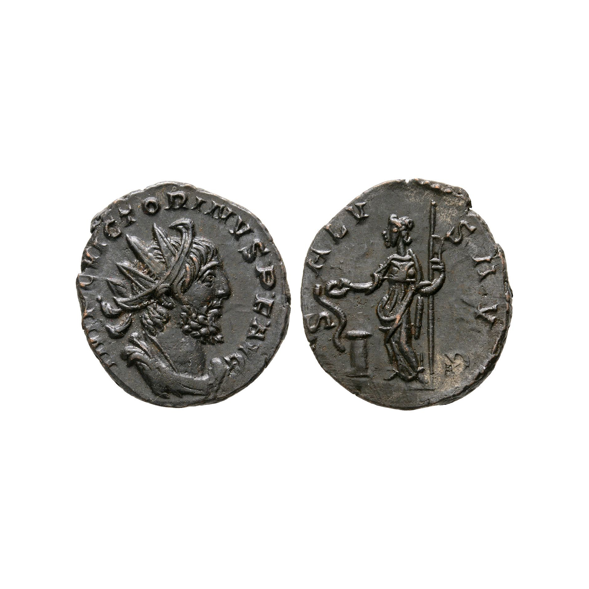 Southern mint. Obv: IMP C VICTORINVS P F AVG, radiate, draped and cuirassed bust right. Rev: SALVS AVG, Salus standing left, feeding serpent rising from altar. 2.52 grams, 18 mm.