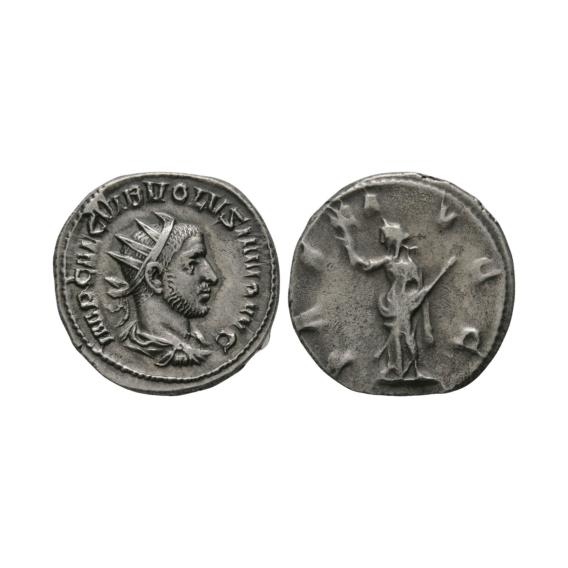 Obv: IMP CAE C VIB VOLVSIANO AVG, radiate, draped bust right. Rev: PAX AVGG, Pax standing left, holding branch and sceptre. 4.02 grams, 21 mm.