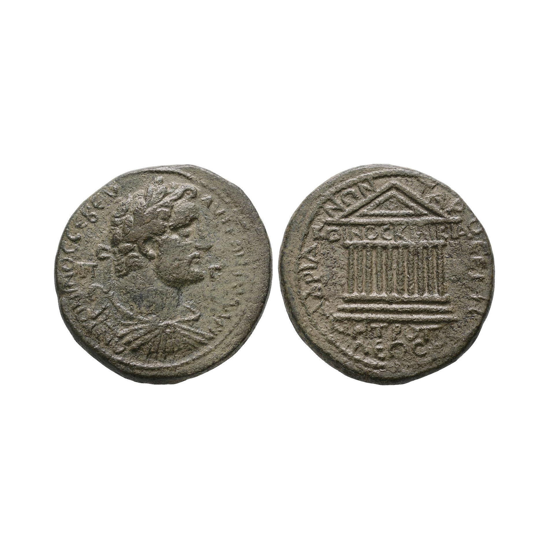 Tarsus, Cilicia. Obv: ΑVΤ ΚΑΙ ΤΙ ΑΙ ΑΔΡI ΑΝΤΩΝΙΝΟϹ ϹЄΒ ЄV Π Π, laureate, draped and cuirassed bust to right. Rev: ΑΔΡΙΑΝΩΝ ΤΑΡϹЄΩΝ ΜΗΤΡΟΠΟΛЄΩϹ, decastyle temple with wreath on pediment; ΚΟΙΝΟϹ ΚΙΛΙΚΙΑϹ on architrave. 16.78 grams, 31 mm.