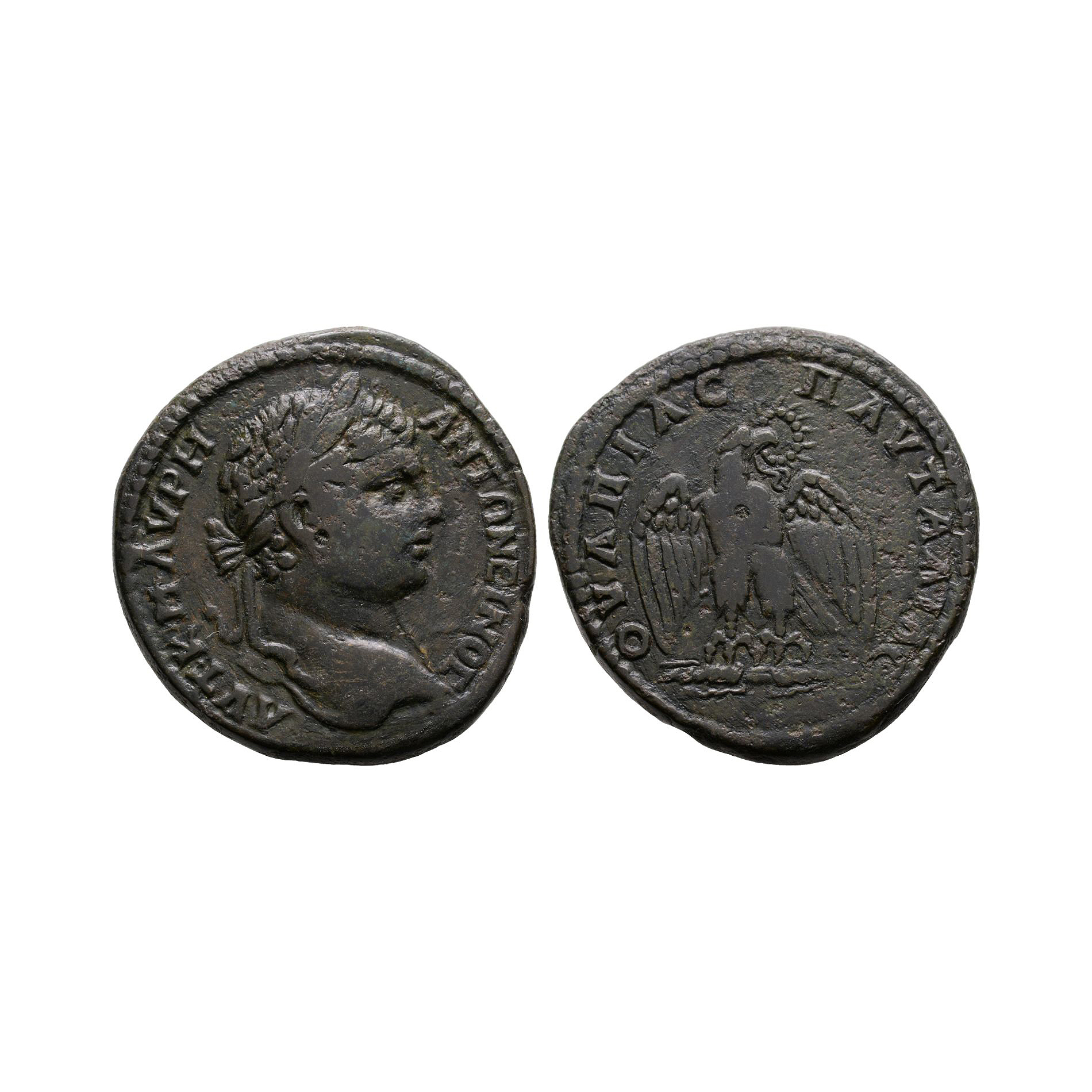 Obv: AYT K M AYRH ANTWNEINOC legend with laureate head right. Rev: OYLPIAC PAYTALIAC legend with eagle standing front on thunderbolt, head right, wings spread, holding wreath in beak. 14.17 grams.