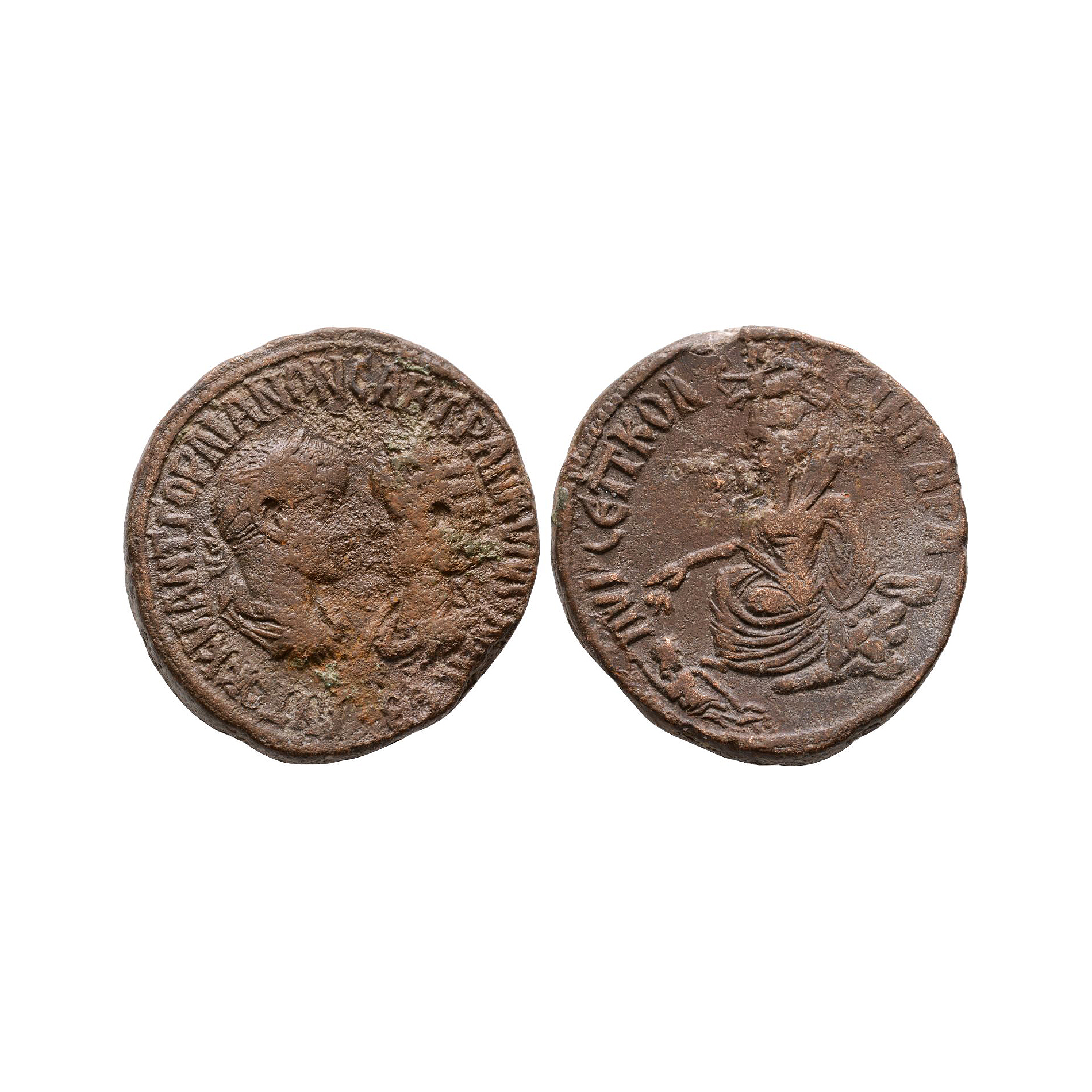 Singara, Mesopotamia. Obv: AYTOK K M ANT GORDIANON CAB TRANKVLLINA CEB, laureate, draped bust of Gordian right, facing draped bust of Tranquillina left. Rev: AYR CEP KOL CINGARA, Tyche seated left on rocks, turreted and holding corn-ears, above her the centaur Sagittarius leaping left shooting bow, river-god swimming left below. 24.22 grams, 31 mm.