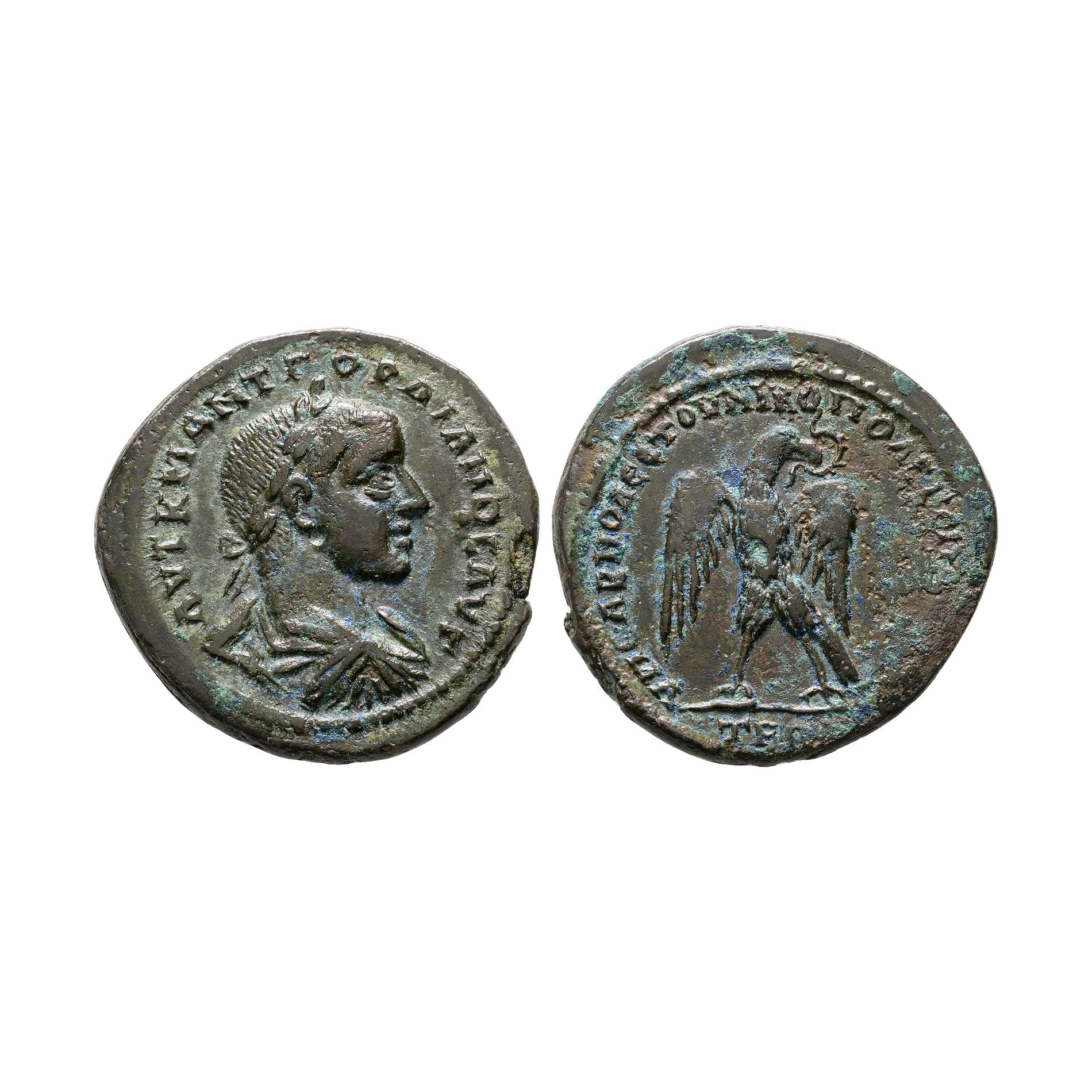 Magistrate Modestos. Obv: AYT K M ANT GORDIANOC AYG, laureate, draped and cuirassed bust right. Rev: YP CAB MODECTOY NIKOPOLITWN PROC ICTRON, eagle standing front, head right, wings spread, holding wreath in beak. 11.65 grams, 28 mm.