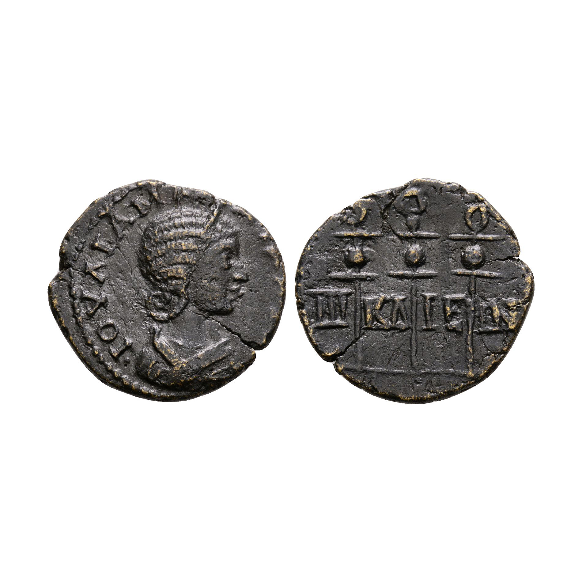Nicaea mint. Obv: IOYLIA MAMAIA AYG legend with draped bust right, wearing stephane. Rev: NI-KA-IE-WN between the shafts of three standards, each surmounted by a wreath. 3.06 grams.