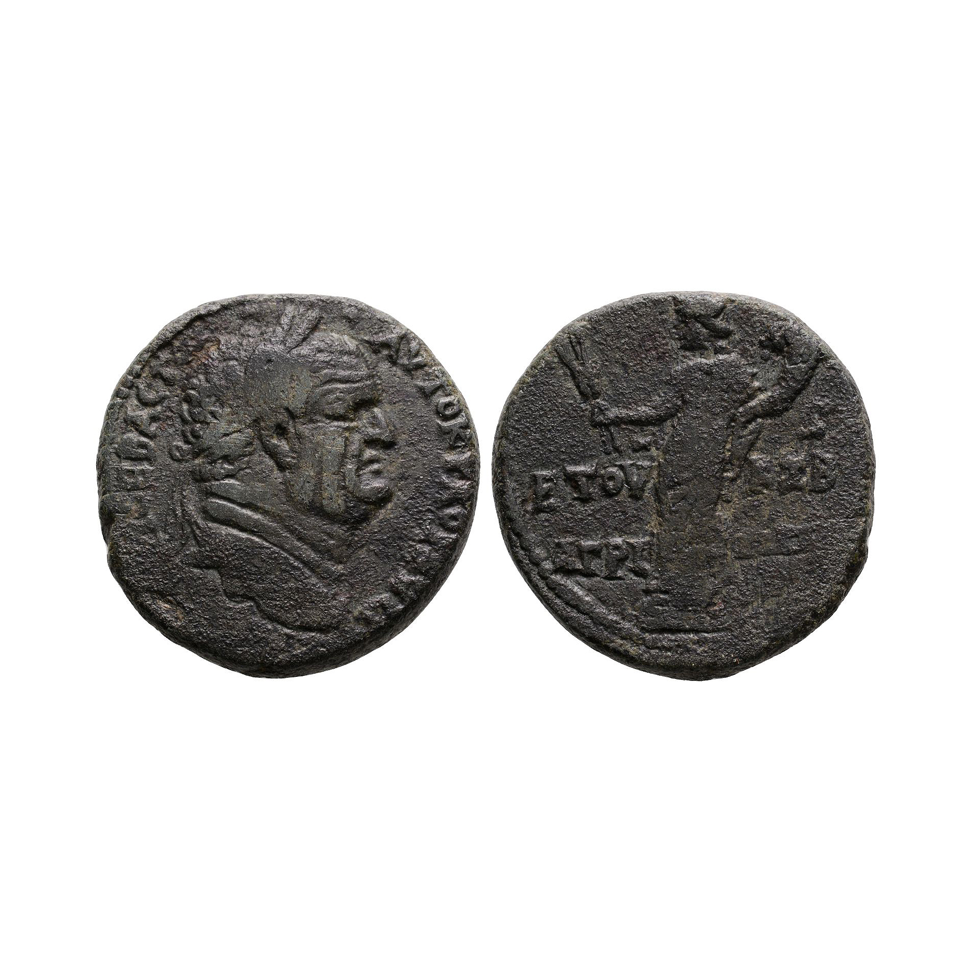 Judaea, dated local year 18. Obv: AYTOKRA OYECPA KAICARI CEBACTw legend with laureate head right. Rev: ETOY-HIB-A AGRI-PPA across fields; Tyche, kalathos on head, standing left, holding two corn-ears and cornucopia. 14.79 grams.