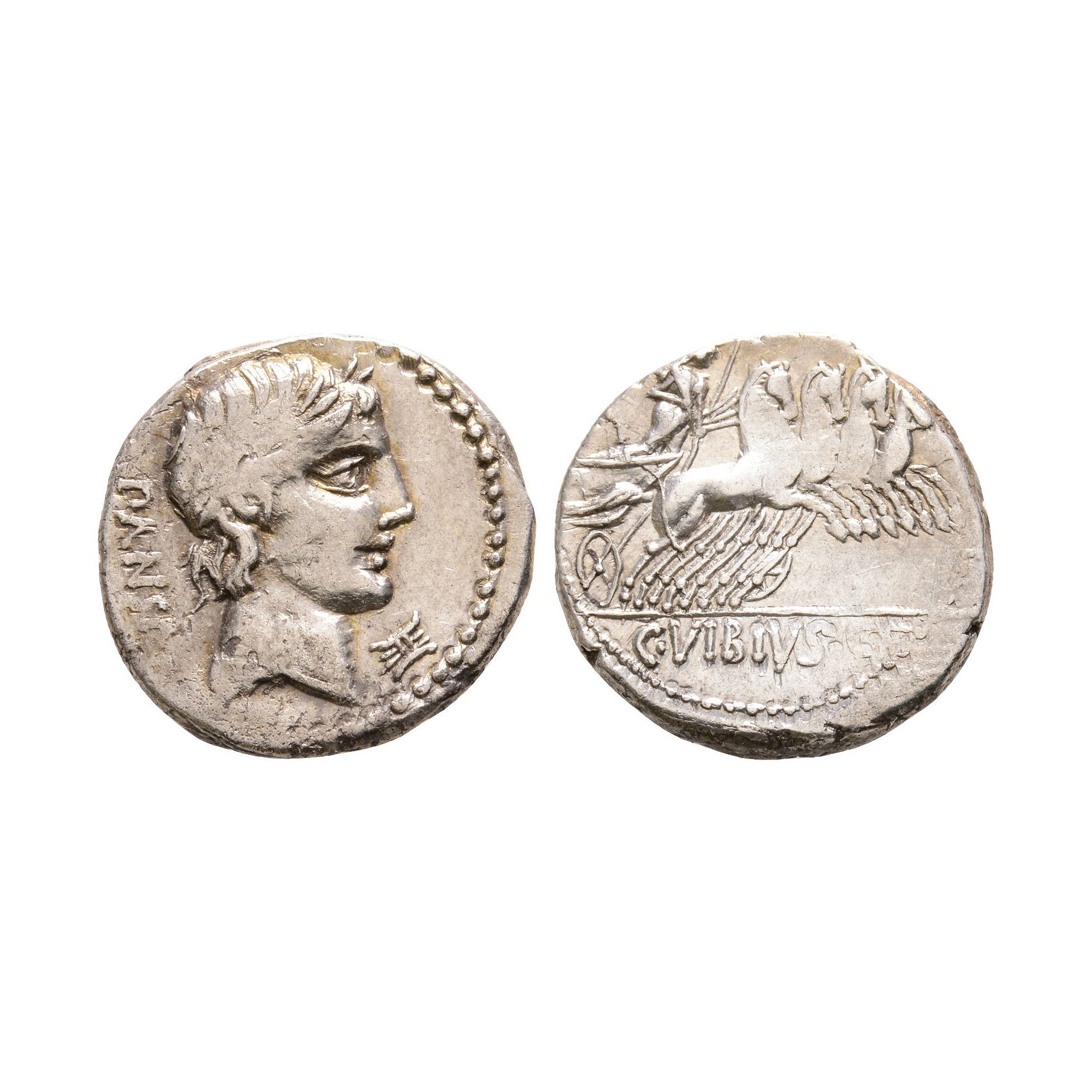Rome mint. Obv: laureate head of Apollo right with PANSA behind and symbol below chin. Rev: Minerva in quadriga right holding spear and trophy; C VIBIVS C F in exergue. 3.83 grams.