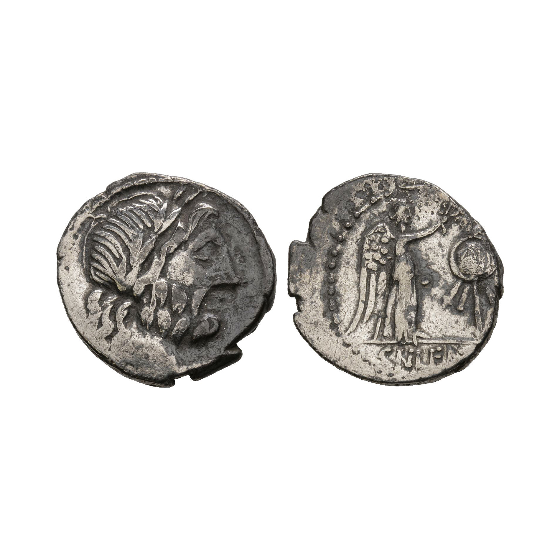 Rome mint. Obv: laureate head of Jupiter right. Rev: Victory standing right crowning trophy; CN LENT (NT in monogram) in exergue. 1.76 grams.