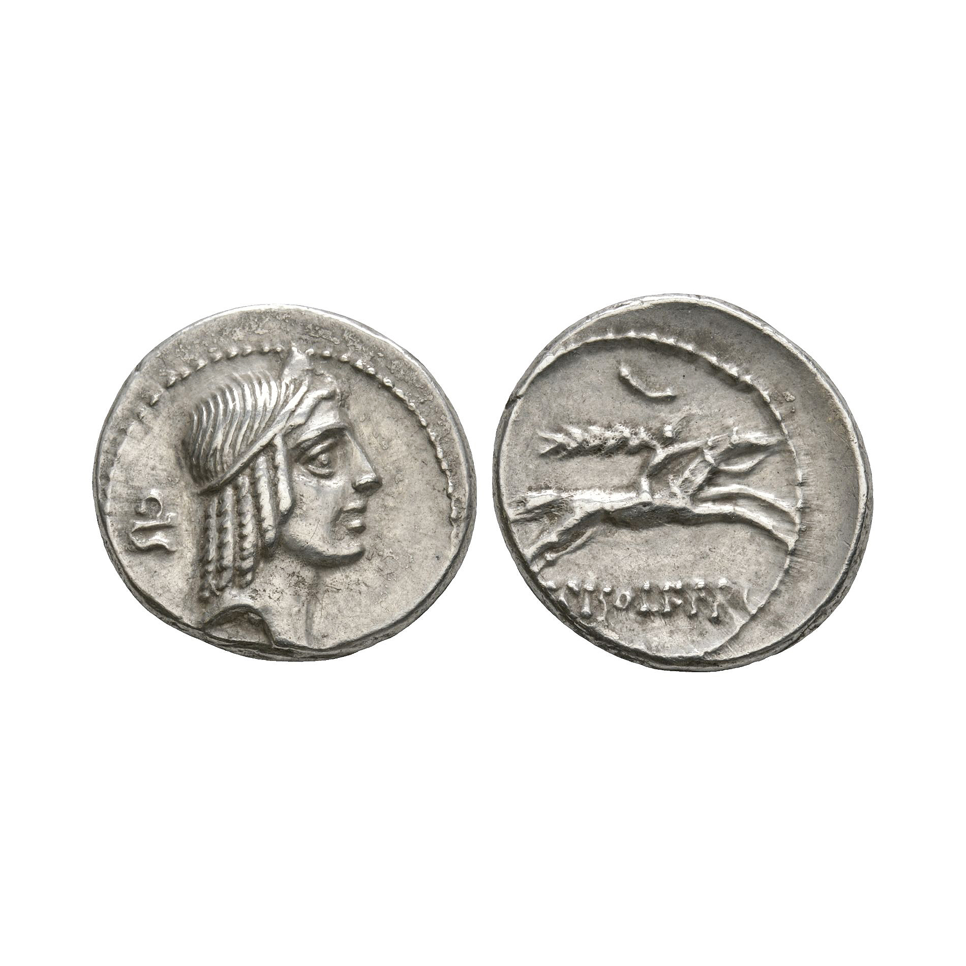 Rome mint. Obv: laureate head of Apollo right; control mark behind. Rev: naked horseman galloping right holding palm; L PISO L F FRVGI below. 3.93 grams.
