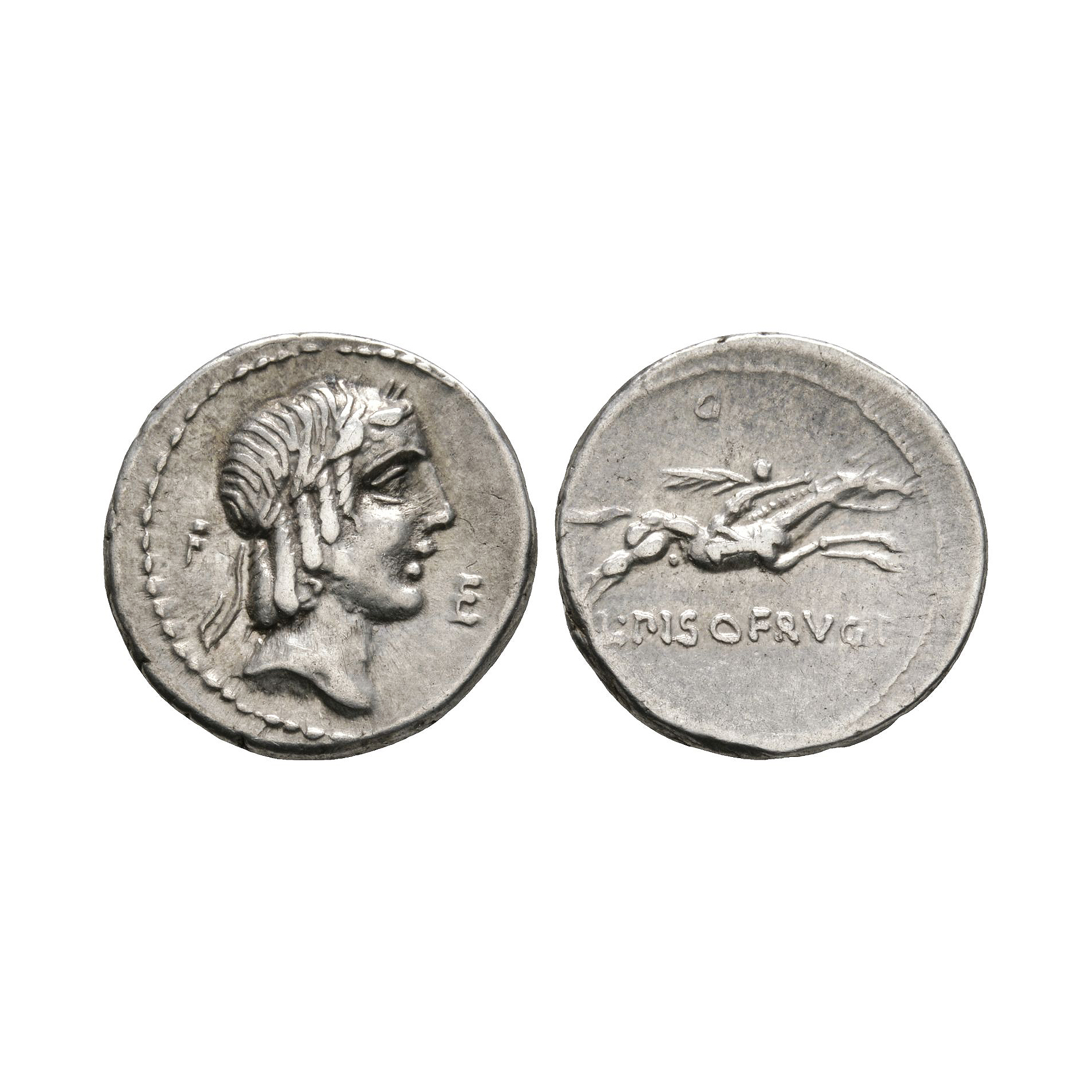 Rome mint. Obv: laureate head of Apollo right; F behind and E before. Rev: naked horseman galloping right with O above and L PISO FRVGI below. 3.92 grams.