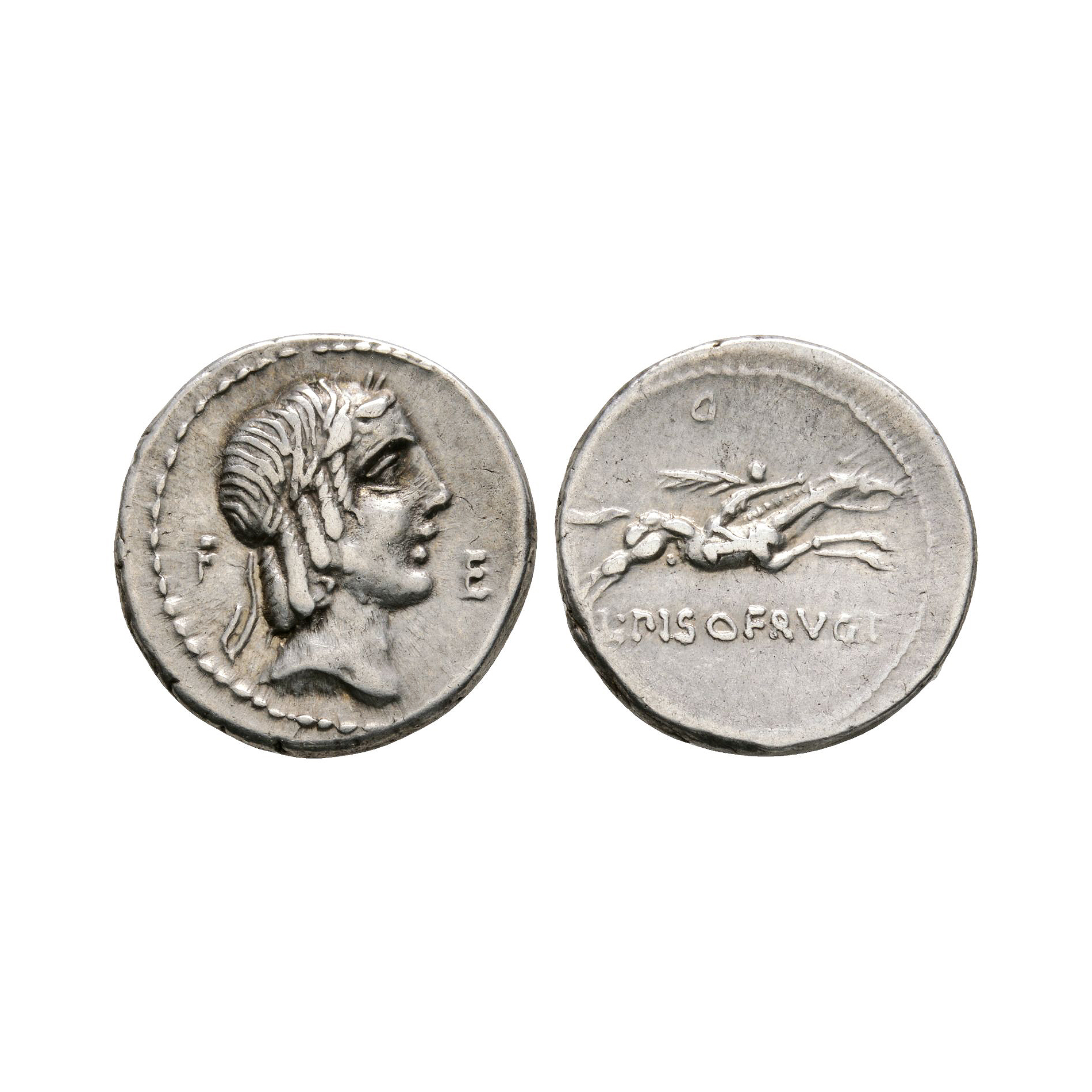 Rome mint. Obv: laureate head of Apollo right; F behind and E before. Rev: naked horseman galloping right with O above and L PISO FRVGI below. 3.92 grams.