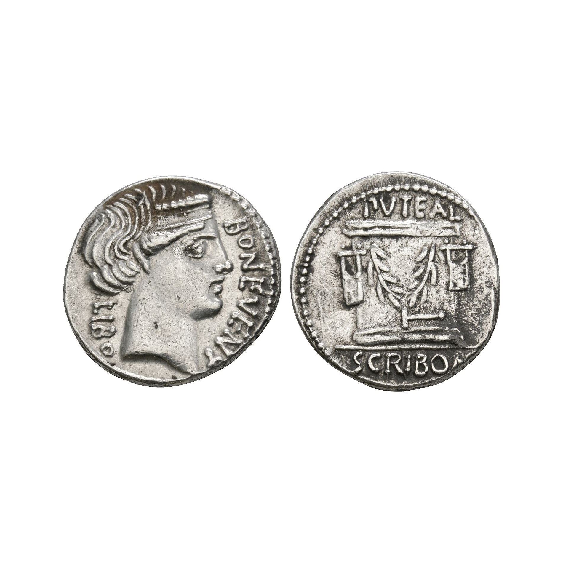 Rome mint. Obv: diademed head of Bonus Eventus right; LIBO behind and BON EVENT before. Rev: the Puteal Scribonianum with garland between two lyres and tongs at base; PVTEAL above and SCRIBON below. 3.64 grams.
