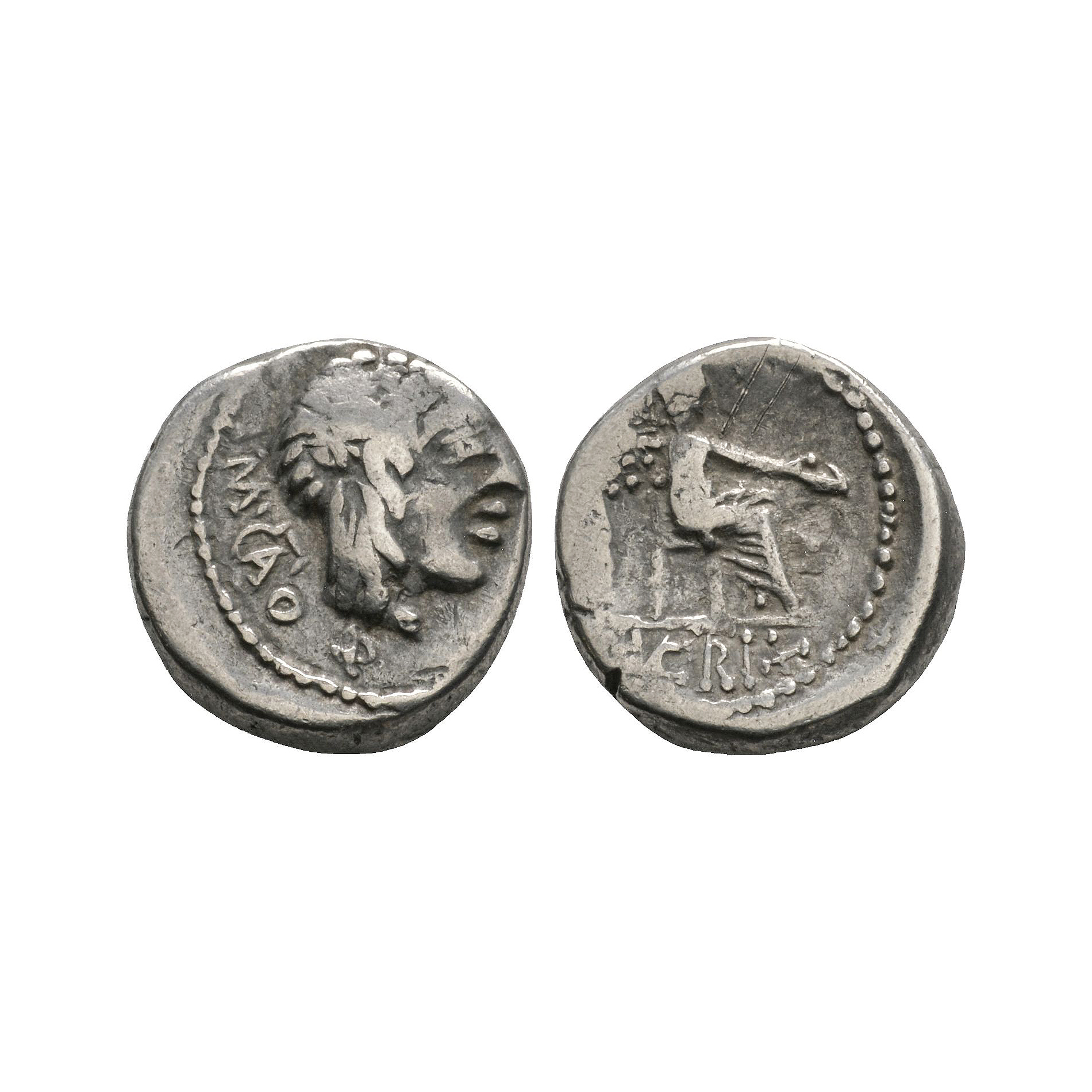 Rome mint. Obv: head of young Bacchus right with M CATO (AT in monogram) behind, symbol below. Rev: Victory seated right holding patera and palm; VICTRIX (TR in monogram) in exergue. 2.19 grams.