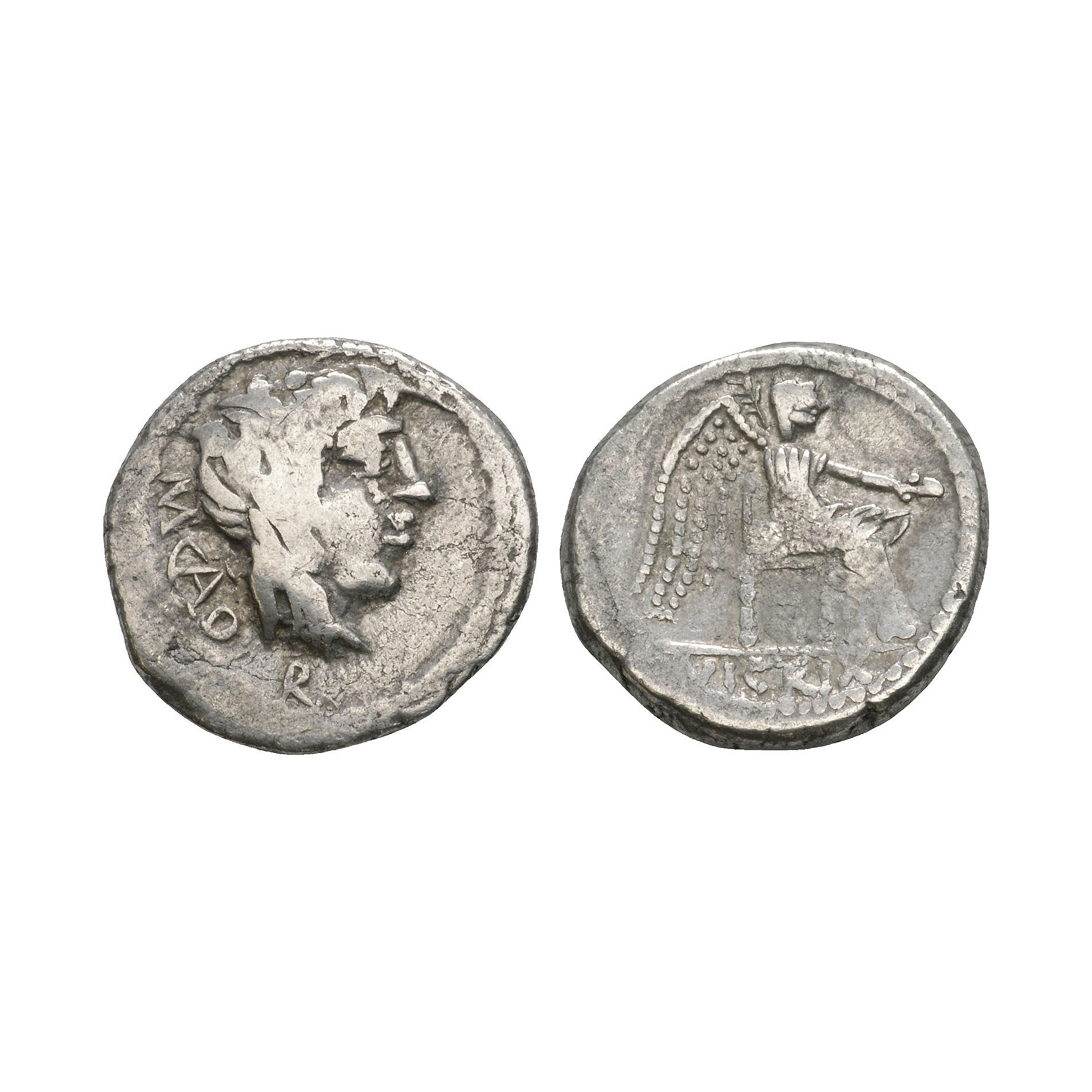 Rome mint. Obv: head of young Bacchus right with M CATO (AT in monogram) behind, R below. Rev: Victory seated right holding patera and palm; VICTRIX (TR in monogram) in exergue. 2.25 grams.