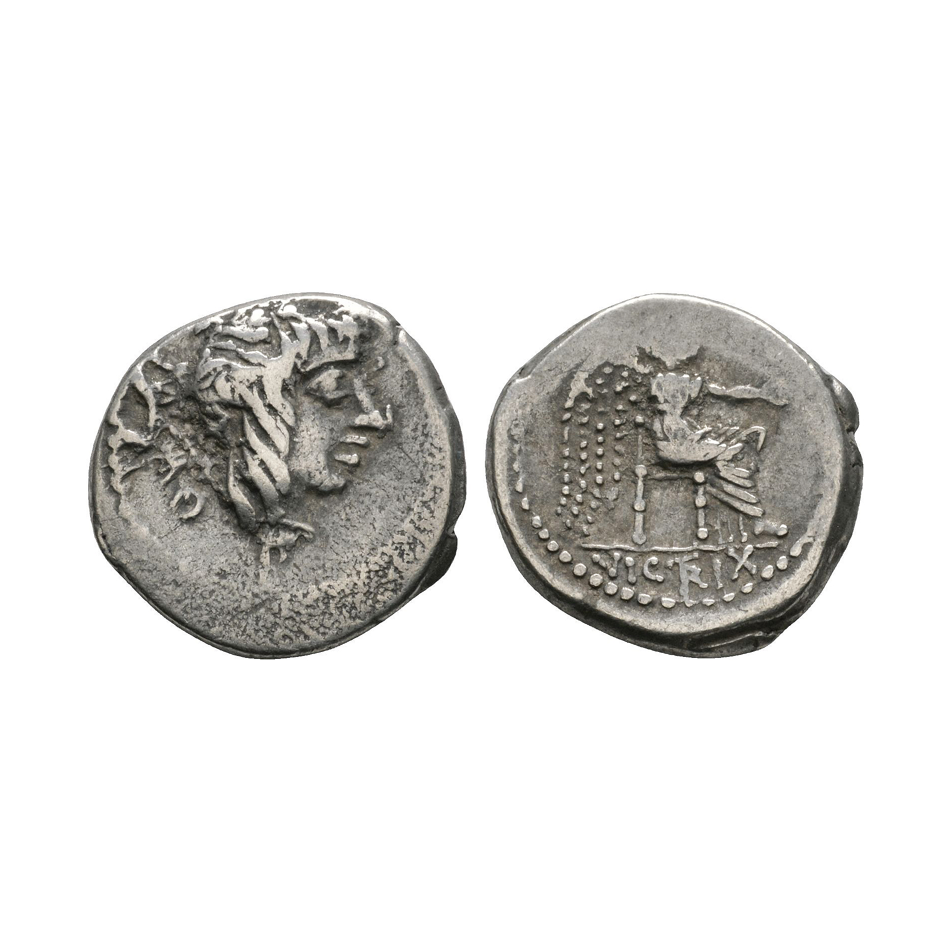 Rome mint. Obv: head of young Bacchus right with M CATO (AT in monogram) behind, symbol below. Rev: Victory seated right holding patera and palm; VICTRIX (TR in monogram) in exergue. 2.13 grams.