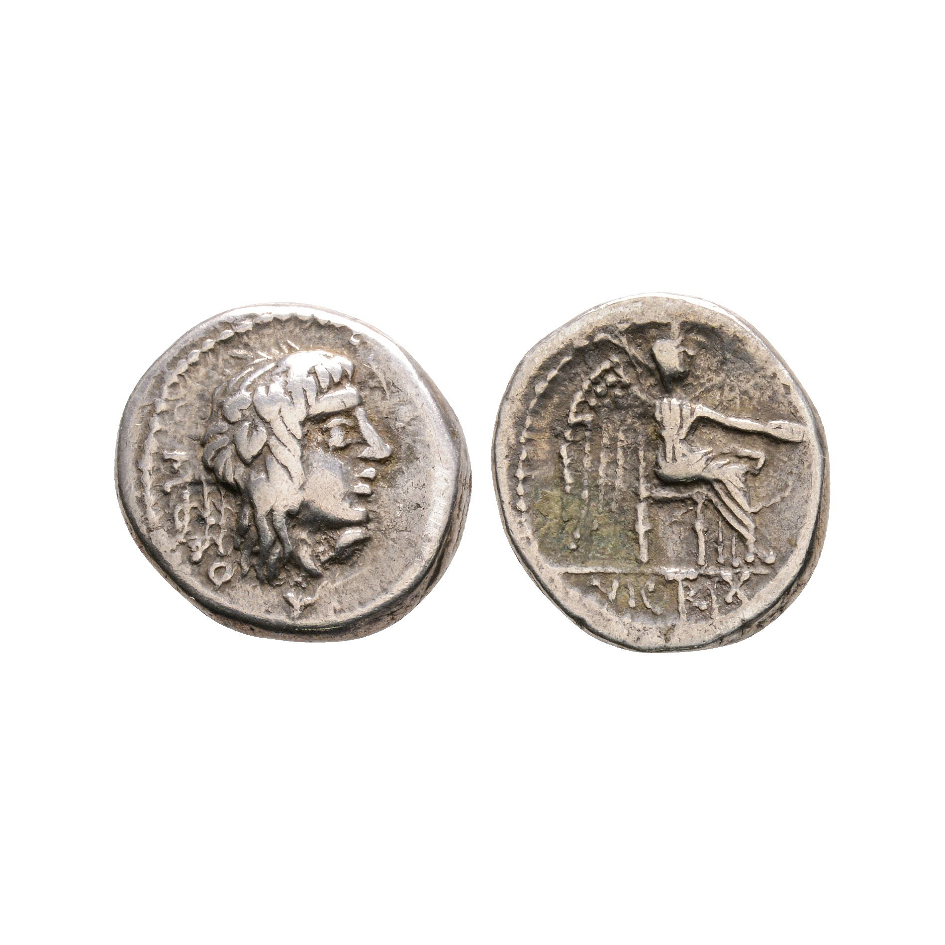 Rome mint. Obv: head of young Bacchus (or Liber) right wreathed in ivy with M CATO (AT in monogram) behind with symbol below. Rev: Victory seated right holding patera and palm; VICTRIX (TR in monogram) in exergue. 2.15 grams.