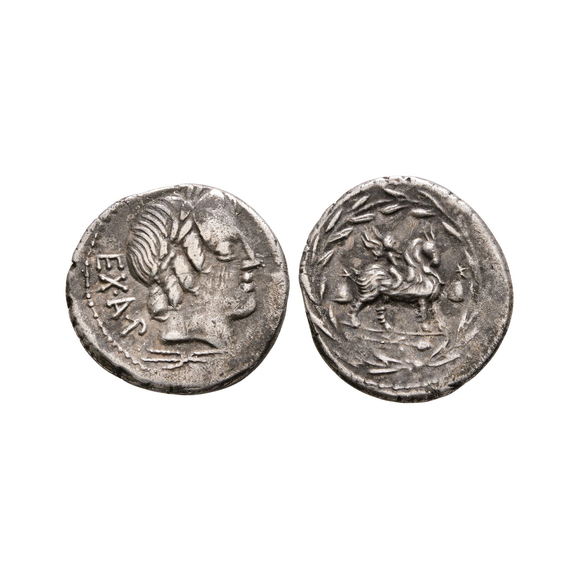 Rome mint. Obv: laureate head of Apollo right with thunderbolt below and EX A P behind. Rev: Cupid sat on goat right with Dioscuri pileus each side and Bacchus thyrsus below, within wreath. 2.98 grams.