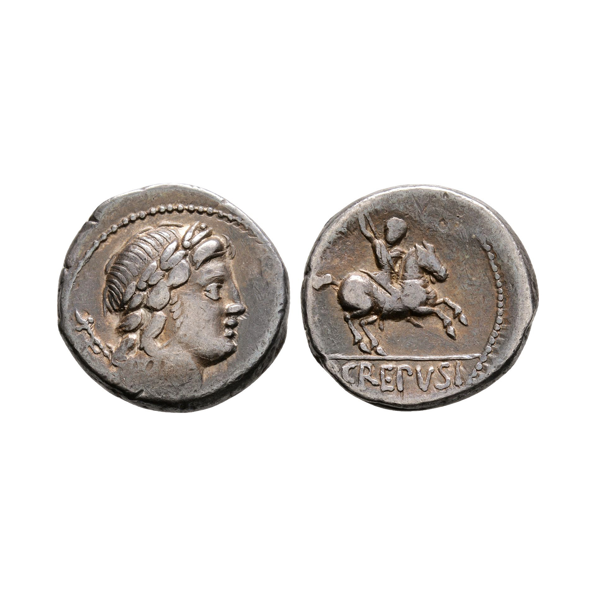 Rome mint. Obv: laureate head of Apollo right with sceptre over shoulder with E behind. Rev: horseman galloping right thrusting spear; P CREPVSI in exergue. 3.71 grams.