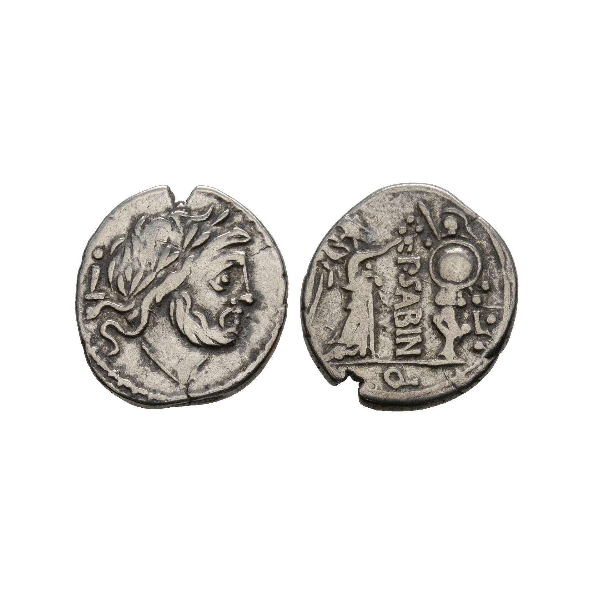 Rome mint. Obv: laureate bust of Jupiter right with L• behind. Rev: Victory standing right crowning trophy with P SABIN between; L• in right field, Q in exergue. 1.92 grams.