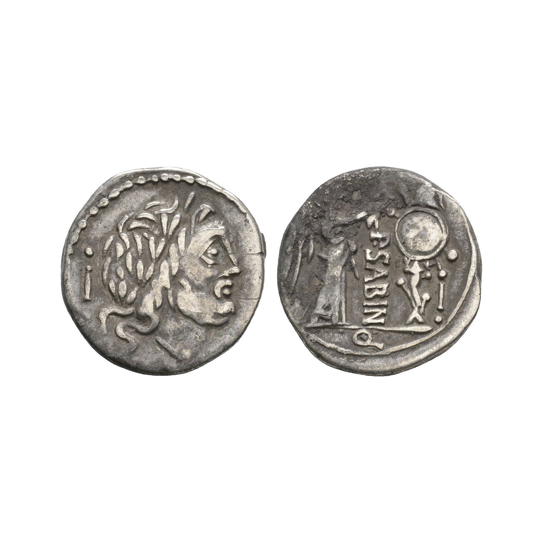 Rome mint. Obv: laureate head of Jupiter right with I behind. Rev: P SABIN between Victory standing right crowning trophy with pellet to right field; Q in exergue. 1.95 grams.