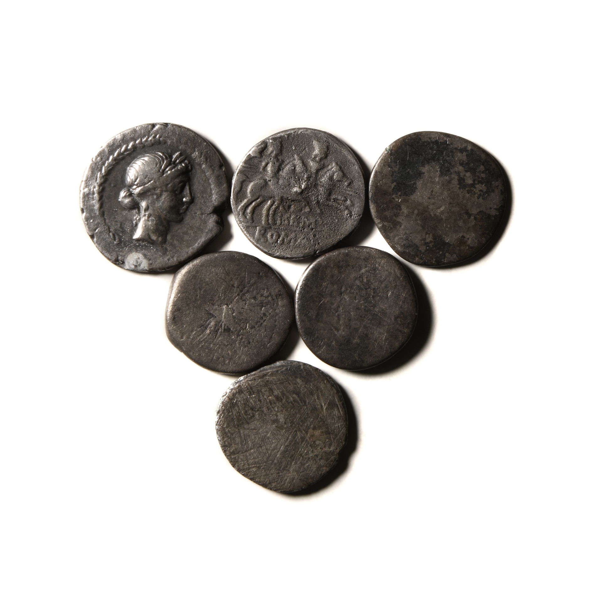 Group comprising: Republican issues (2), Marc Antony (2, legionary type), uncertain (2). 16.58 grams total.