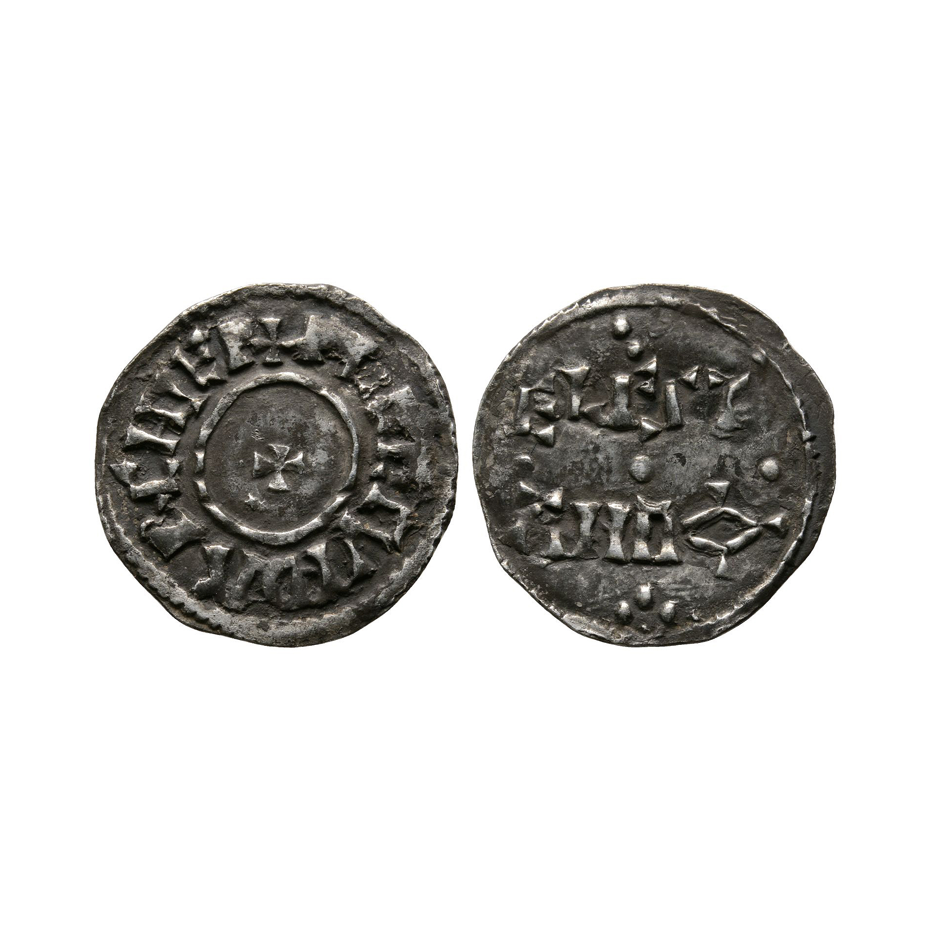 Class 1. Obv: small cross with +PLEGMVND ARCHIEP legend. Rev: pellet trefoil above and below ELFS / TAN in two lines with three crosses between for the moneyer Elfstan. 1.43 grams, 20 mm.