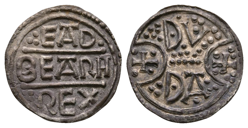 Kings of Kent. Obv: with EAD / BEARHT / REX in three lines with HT in monogram divided by pellet-ended bars with trefoil before first and third lines and pellet after first. Rev: with DV / DA in two lines with many pellets around, within a shield-like device with cross and pellets at sides. 1.39 grams.