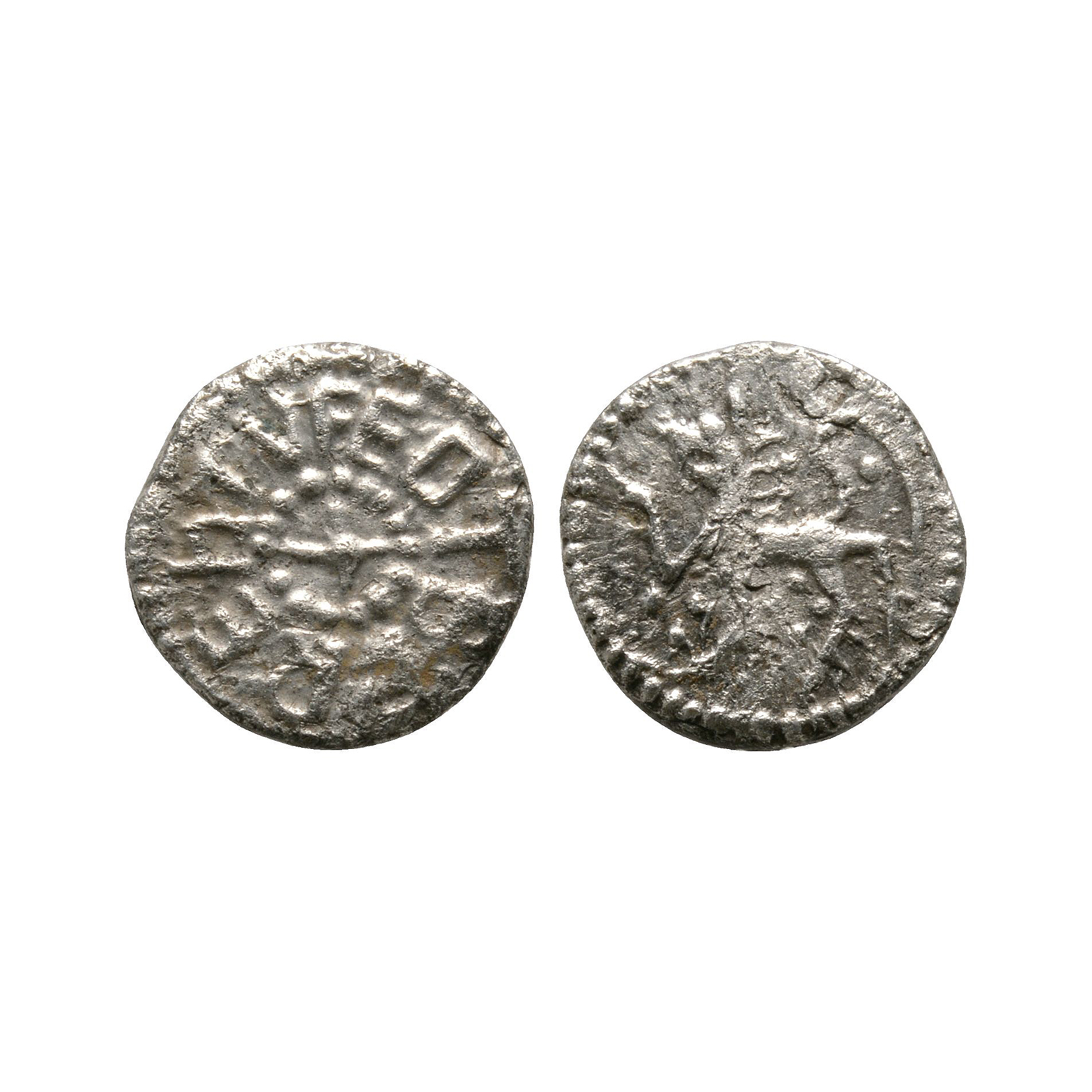 Obv: small cross within pellet circle, with EDTBEREHTVFE legend. Rev: stylised stag left with pellets in field. 0.89 grams, 12 mm.