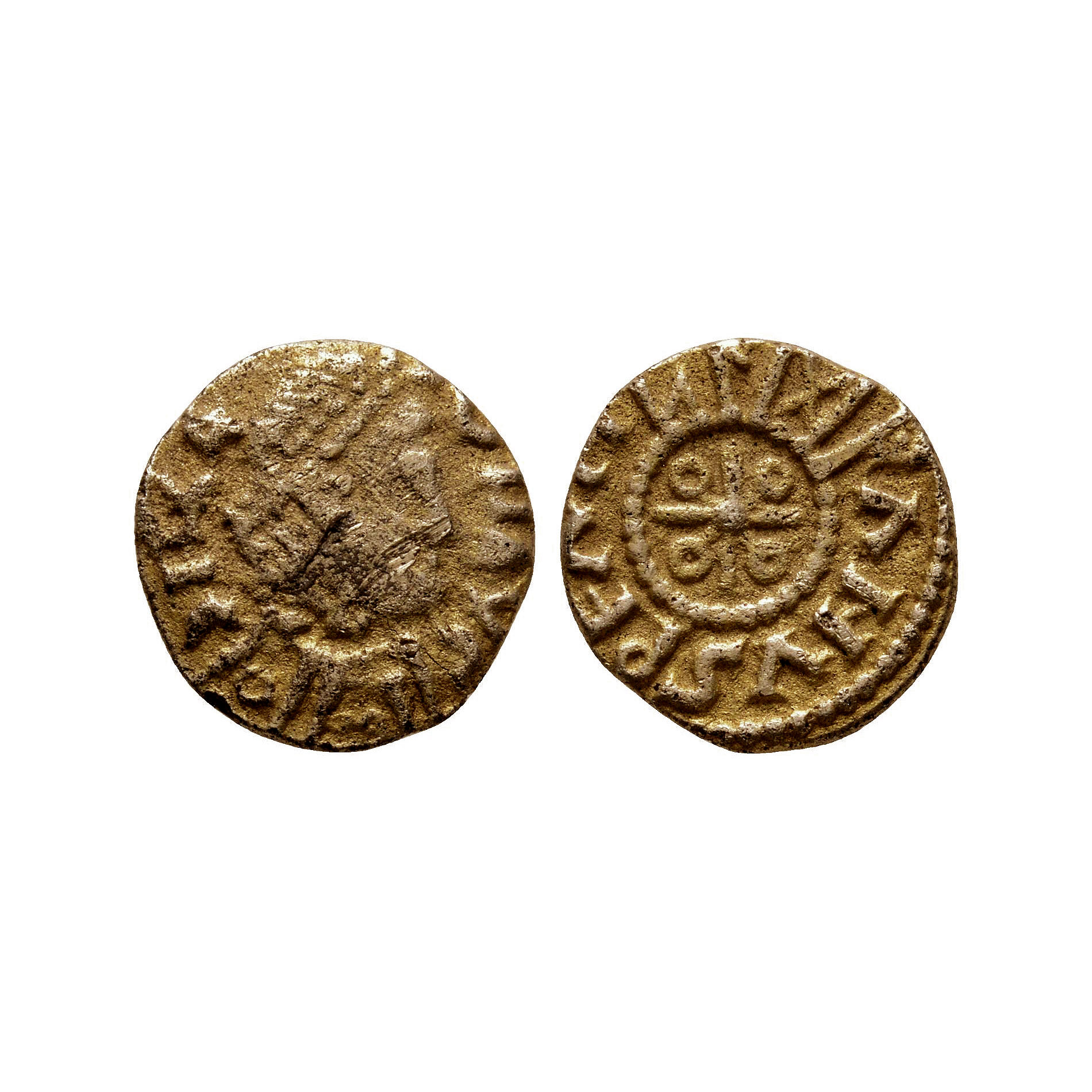 Pada Type III. Obv: diademed bust right, legend around. Rev: cross with annulets in angles within beaded inner circle, ΛNVSPNΛI legend including runic PADA within outer beaded circle. 1.22 grams, 12 mm.