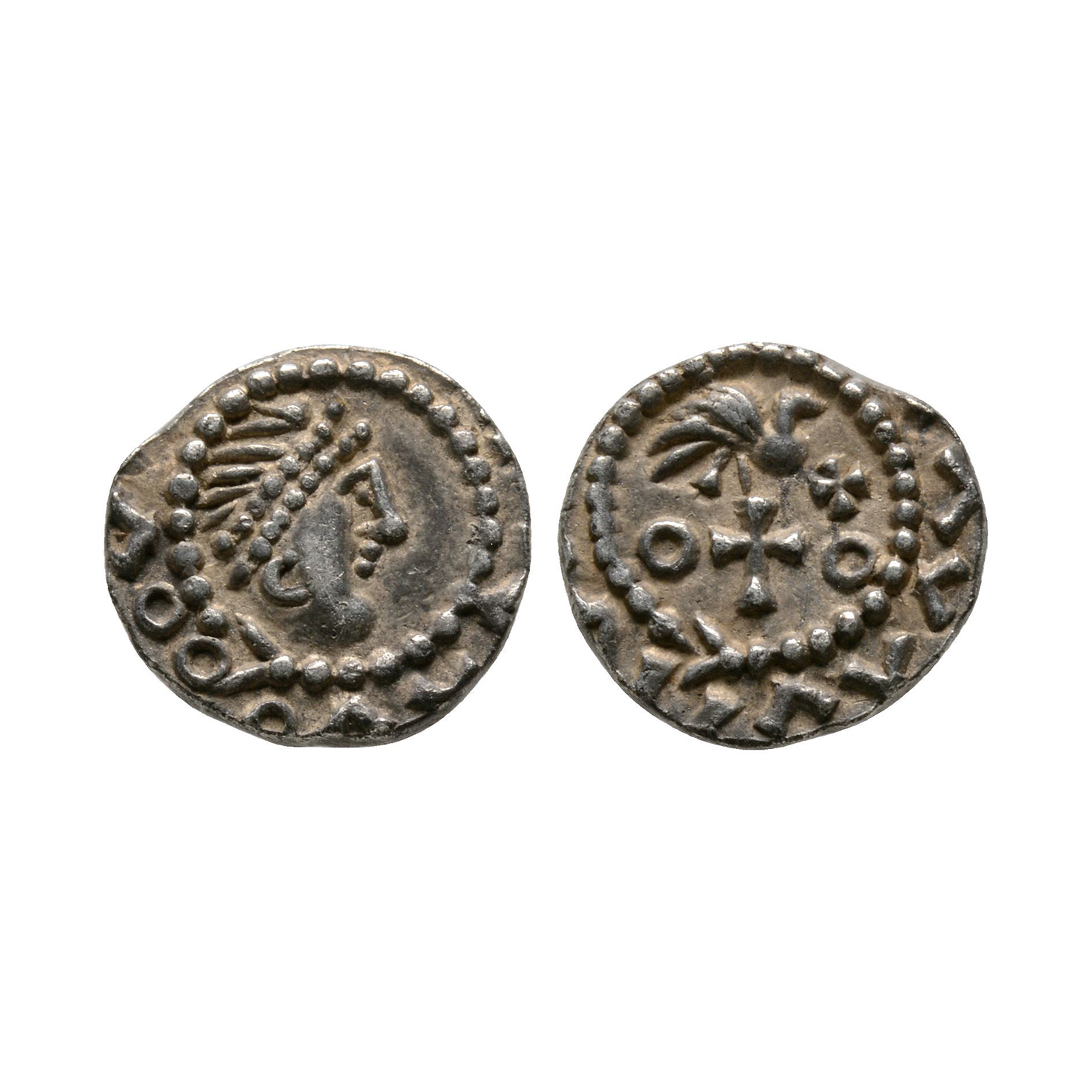 Obv: profile bust right within serpent inner circle (head at 7 o'clock) with legend around. Rev: bird right on cross with small cross before and annulet each side with legend around. 1.27 grams, 12 mm.