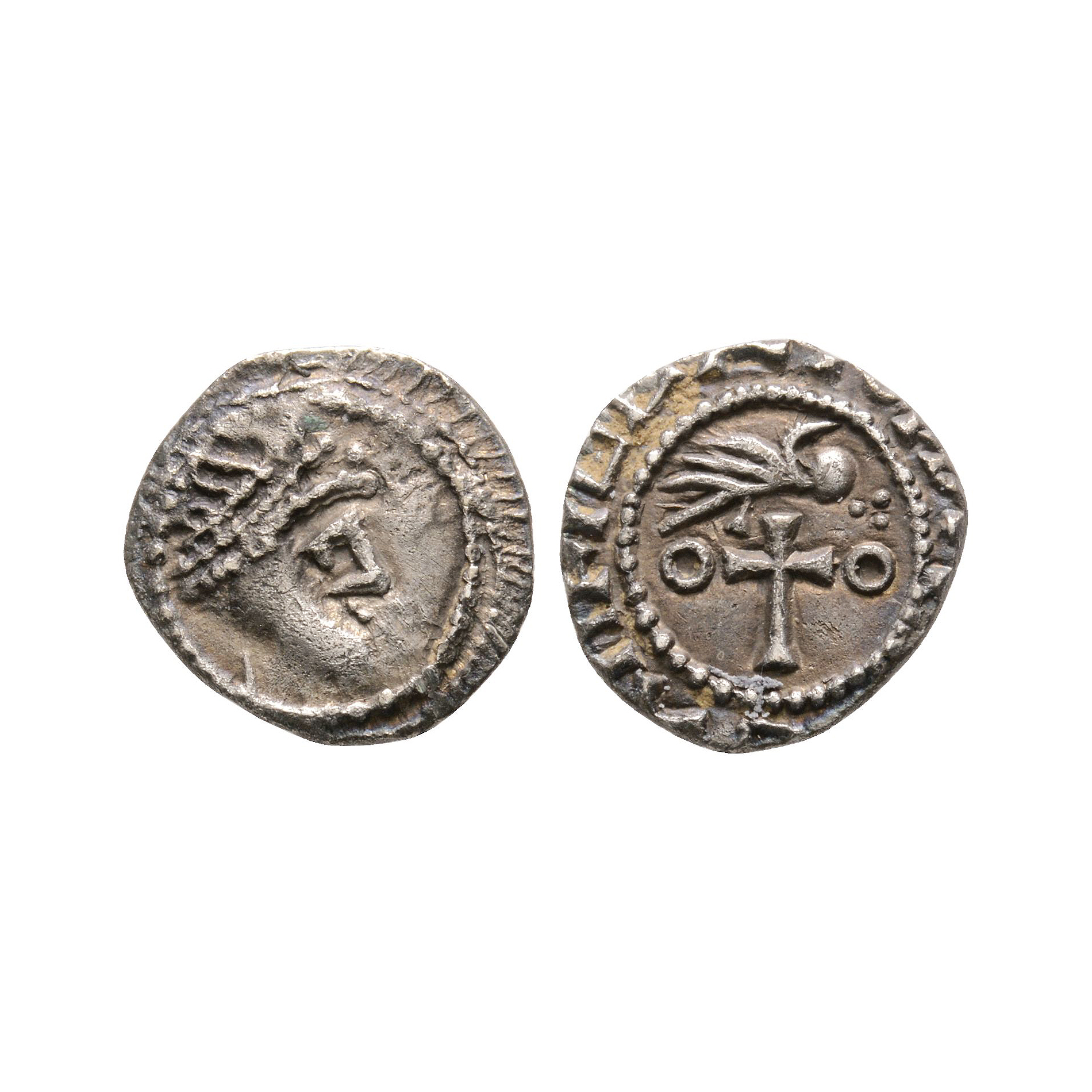 Obv: diademed head right within serpent circle. Rev: linear bird on cross with trefoil before and annulet each side within beaded circle with blundered legend. 1.21 grams.