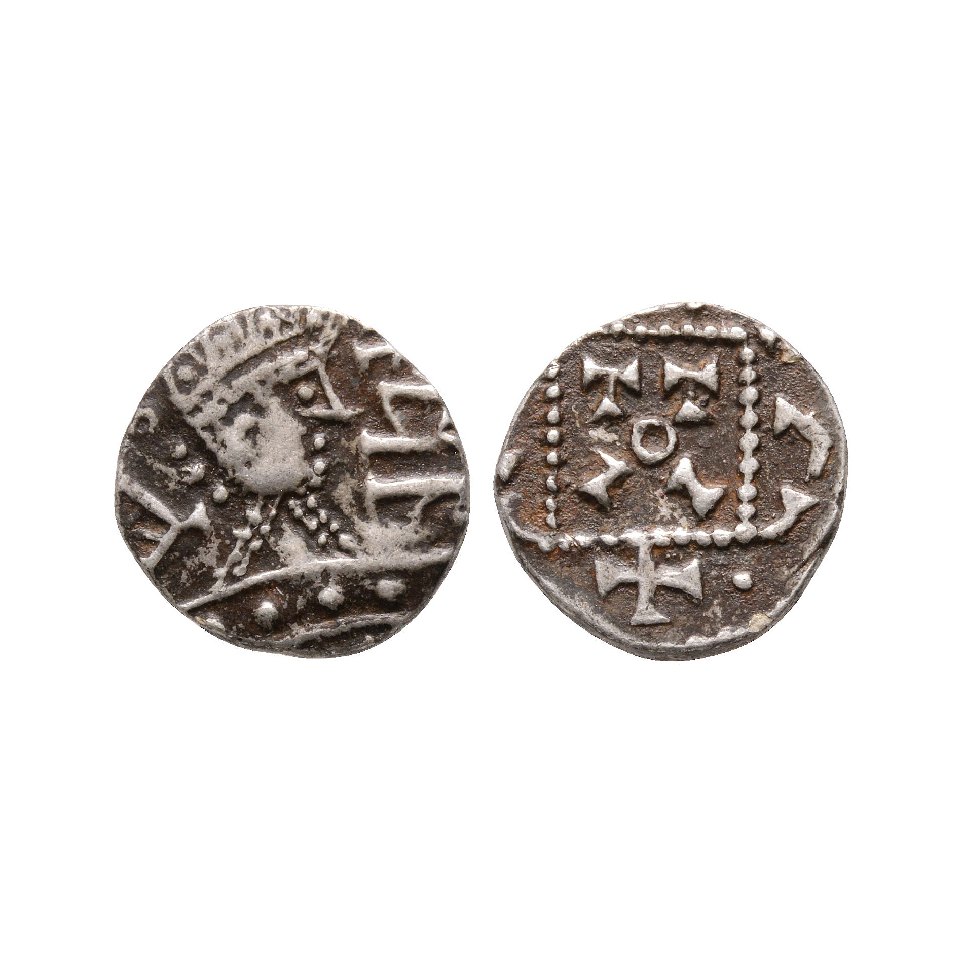 Obv: radiate bust right with annulets behind head and neck, to the front runic FMCF. Rev: variety C1, standard, TOTII; variety C2, four crosses abutting around the central standard. 1.23 grams, 11 mm.