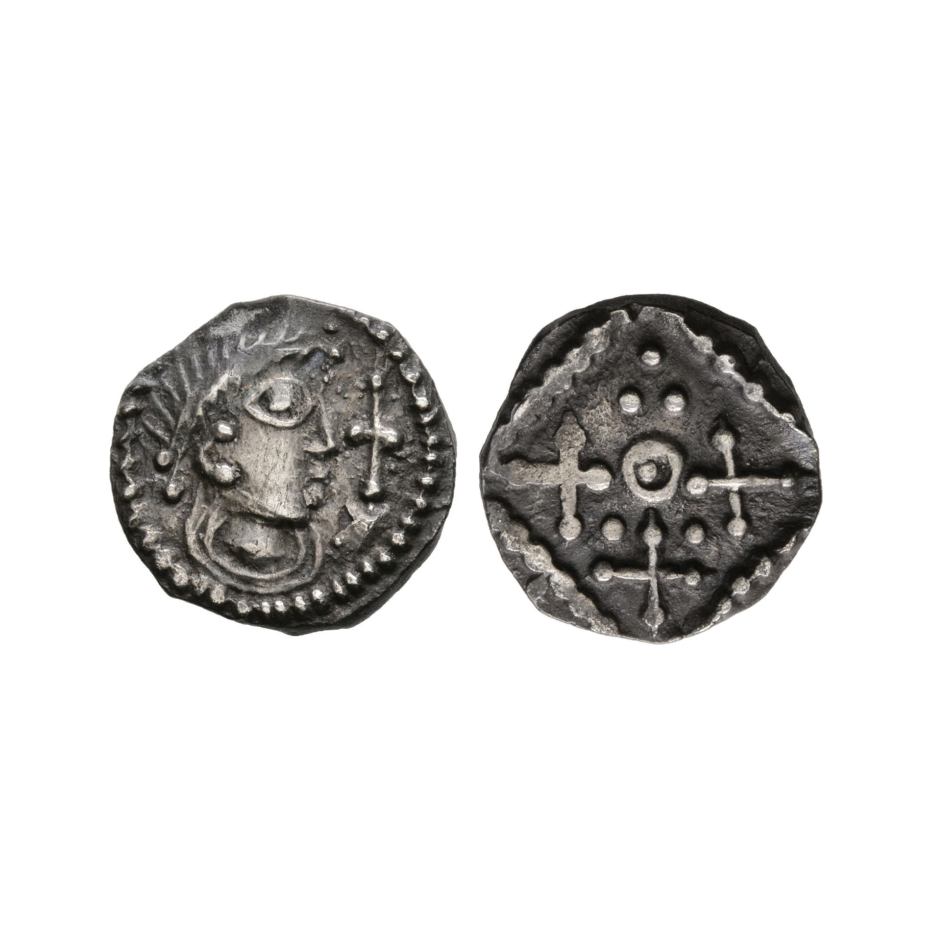 Obv: diademed bust right holding in front a short cross, within a pelleted border. Rev: standard with three saltires and trefoil of pellets in fourth quarter, pellet in annulet in centre, within a beaded square. 0.98 grams.