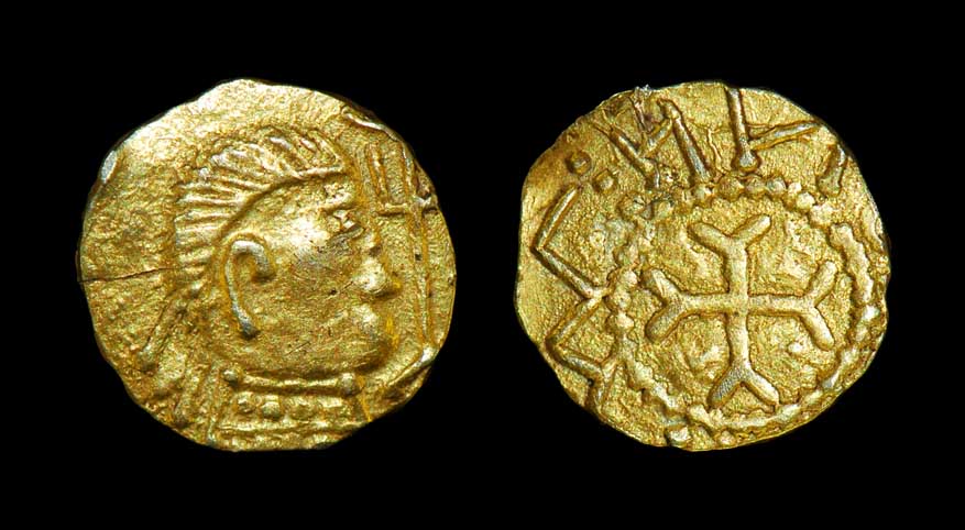 Circa 620-640 AD, Kent (Canterbury?). Obv: profile diademed bust right with three ties and trident before. Rev: cross fourchee with blundered legend. Gold, 1.24 grams.